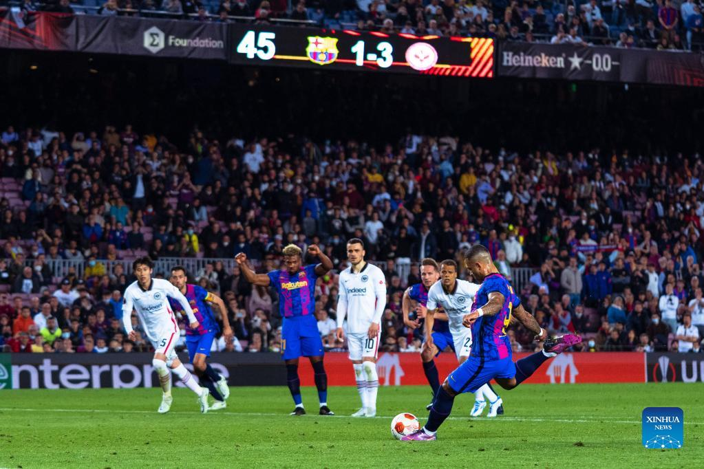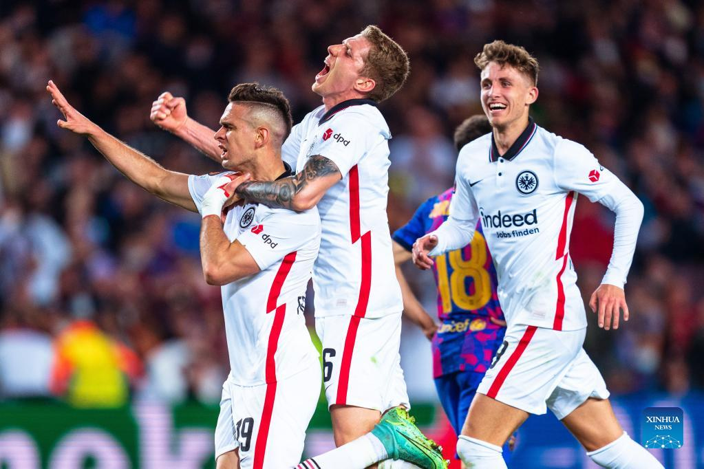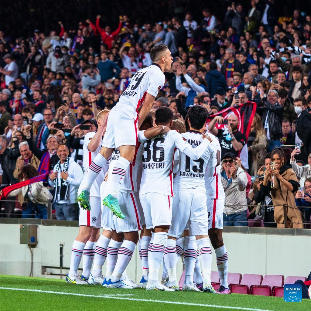 Players of Frankfurt celebrates scoring during the UEFA Europa League quarterfinal second leg match between FC Bacelona of Spain and Eintracht Frankfurt of Germany in Barcelona, Spain, April 14, 2022. (Photo by Joan Gosa/Xinhua)