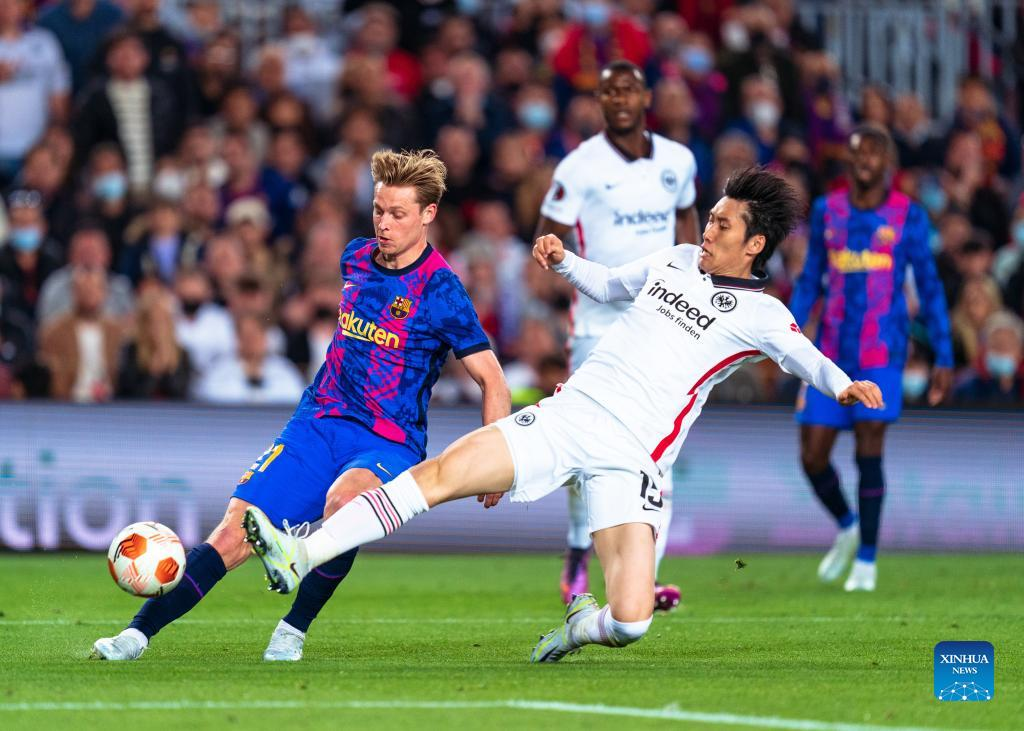 Frenkie de Jong (L) of Barcelona vies with Kamada Daichi of Frankfurt during the UEFA Europa League quarterfinal second leg match between FC Bacelona of Spain and Eintracht Frankfurt of Germany in Barcelona, Spain, April 14, 2022. (Photo by Joan Gosa/Xinhua)