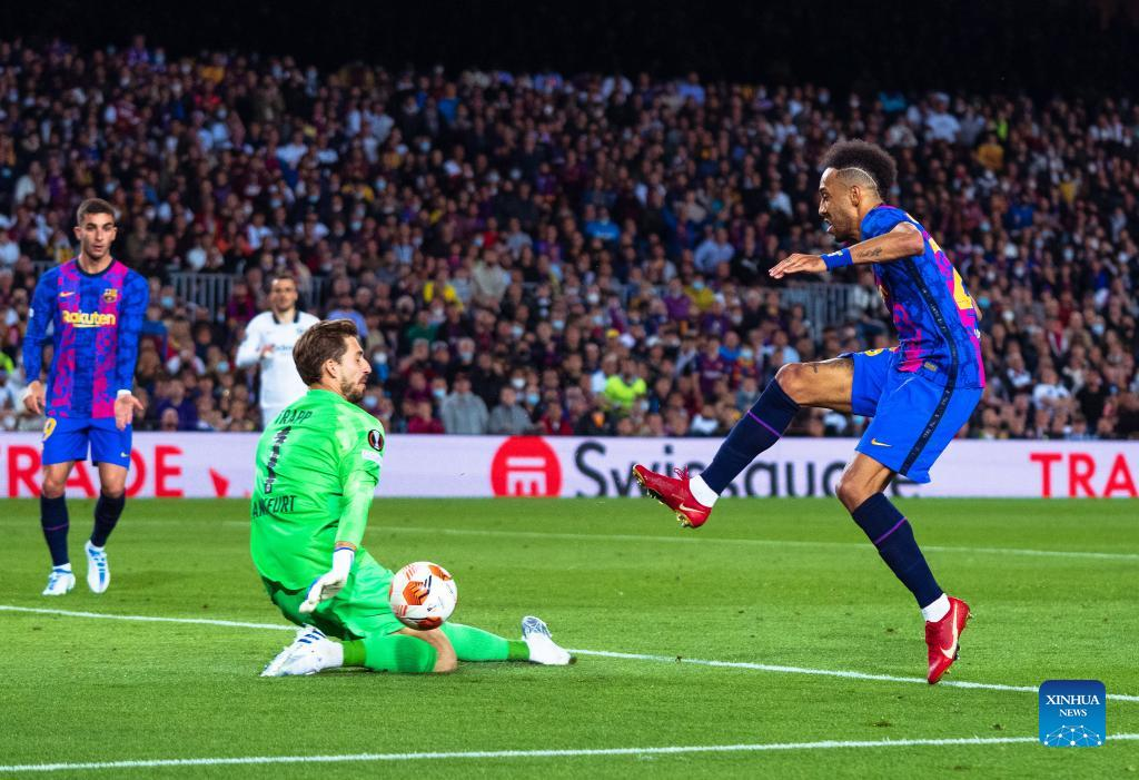 Aubameyang (R) of Barcelona vies with Kevin Trapp of Frankfurt during the UEFA Europa League quarterfinal second leg match between FC Bacelona of Spain and Eintracht Frankfurt of Germany in Barcelona, Spain, April 14, 2022. (Photo by Joan Gosa/Xinhua)