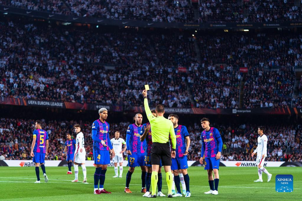 Referee shows a yellow card to Eric Garcia (front, C) of Barcelona during the UEFA Europa League quarterfinal second leg match between FC Bacelona of Spain and Eintracht Frankfurt of Germany in Barcelona, Spain, April 14, 2022. (Photo by Joan Gosa/Xinhua)