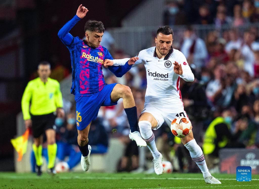 Pedri (L) of Barcelona vies with Filip Kostic of Frankfurt during the UEFA Europa League quarterfinal second leg match between FC Bacelona of Spain and Eintracht Frankfurt of Germany in Barcelona, Spain, April 14, 2022. (Photo by Joan Gosa/Xinhua)