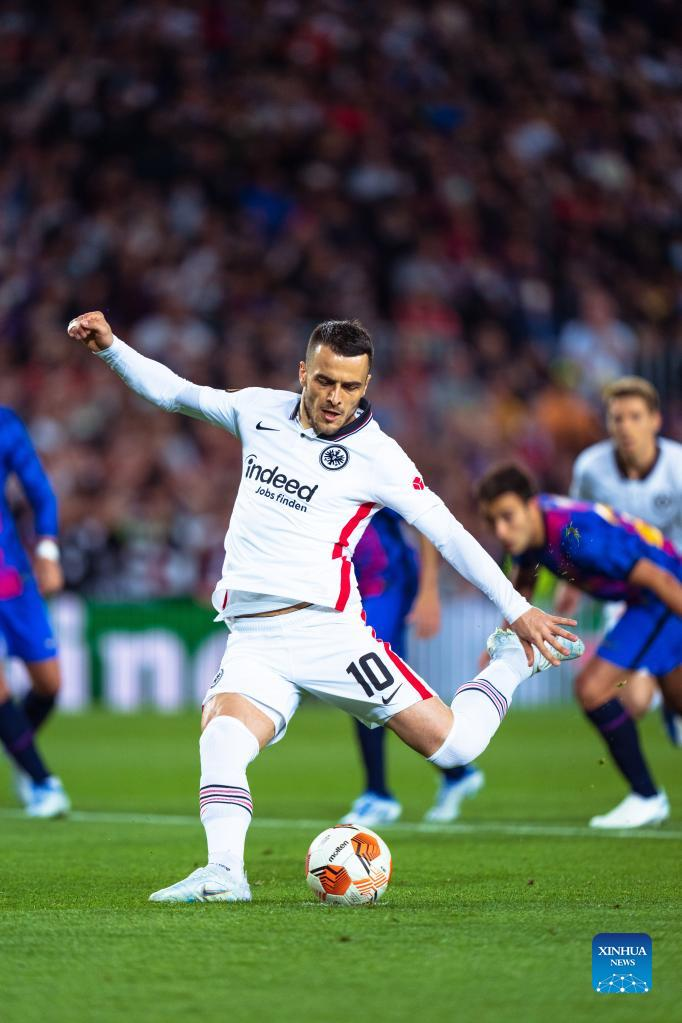 Filip Kostic of Frankfurt shoots and scores a penalty goal during the UEFA Europa League quarterfinal second leg match between FC Bacelona of Spain and Eintracht Frankfurt of Germany in Barcelona, Spain, April 14, 2022. (Photo by Joan Gosa/Xinhua)