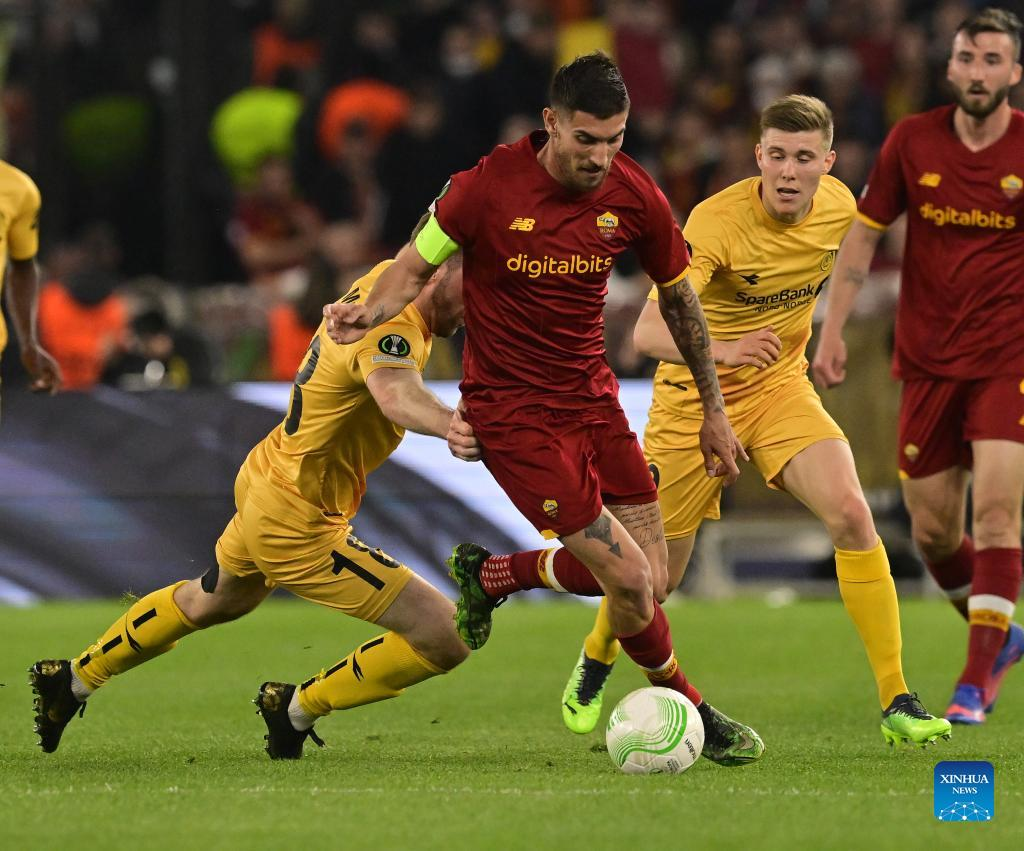 Roma's Lorenzo Pellegrini (2nd L) vies with Bodo/Glimt's Bride Moe during the UEFA Europa Conference League quarterfinal second leg match between Roma of Italy and Bodo/Glimt of Norway in Rome, Italy, April 14, 2022. (Photo by Augusto Casasoli/Xinhua)
