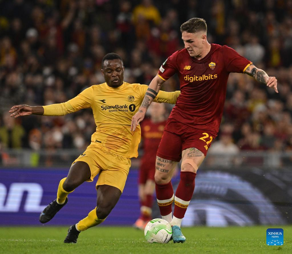 Roma's Nicolo Zaniolo (L) scores his third goal during the UEFA Europa Conference League quarterfinal second leg match between Roma of Italy and Bodo/Glimt of Norway in Rome, Italy, April 14, 2022. (Photo by Augusto Casasoli/Xinhua)