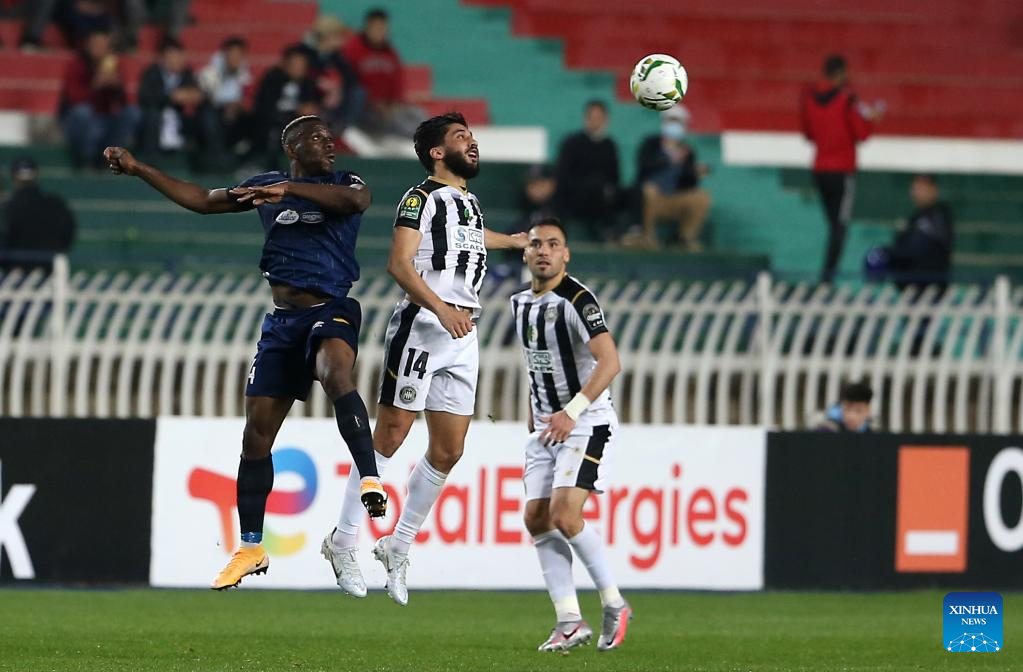 Es Setif's Amir Karaoui (C) vies with Esperance's Kingsley Eduwo (L) during the CAF Champions League 2022 Quarter Final Leg One football match between Es Setif and Esperance at 5th July Stadium in Algiers, Algeria, April 15, 2022. (Str/Xinhua)