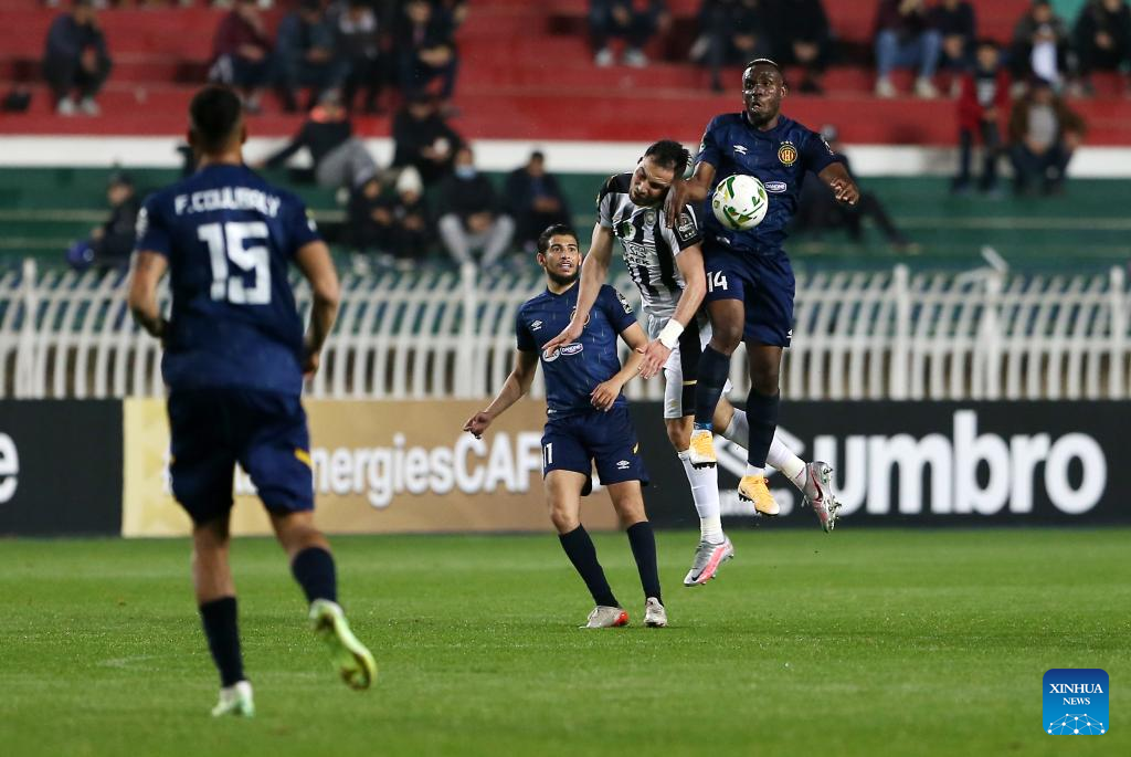 Esperance's Kingsley Eduwo (R) competes during the CAF Champions League 2022 Quarter Final Leg One football match between Es Setif and Esperance at 5th July Stadium in Algiers, Algeria, April 15, 2022. (Str/Xinhua)