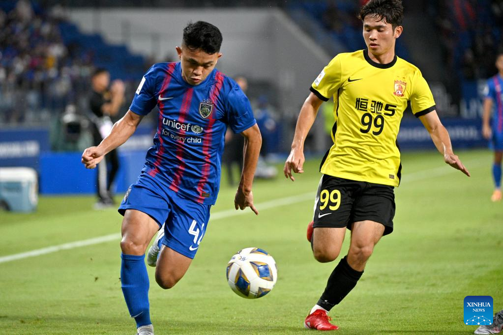 Wang Tianqing (L) of Guangzhou FC vies with Arif Aiman of Johor Darul Ta'zim during the AFC Champions League 2022 Group I match between Johor Darul Ta'zim of Malaysia and Guangzhou FC of China in Johor Bahru, Malaysia, April 15, 2022. (Xinhua/Zhu Wei)