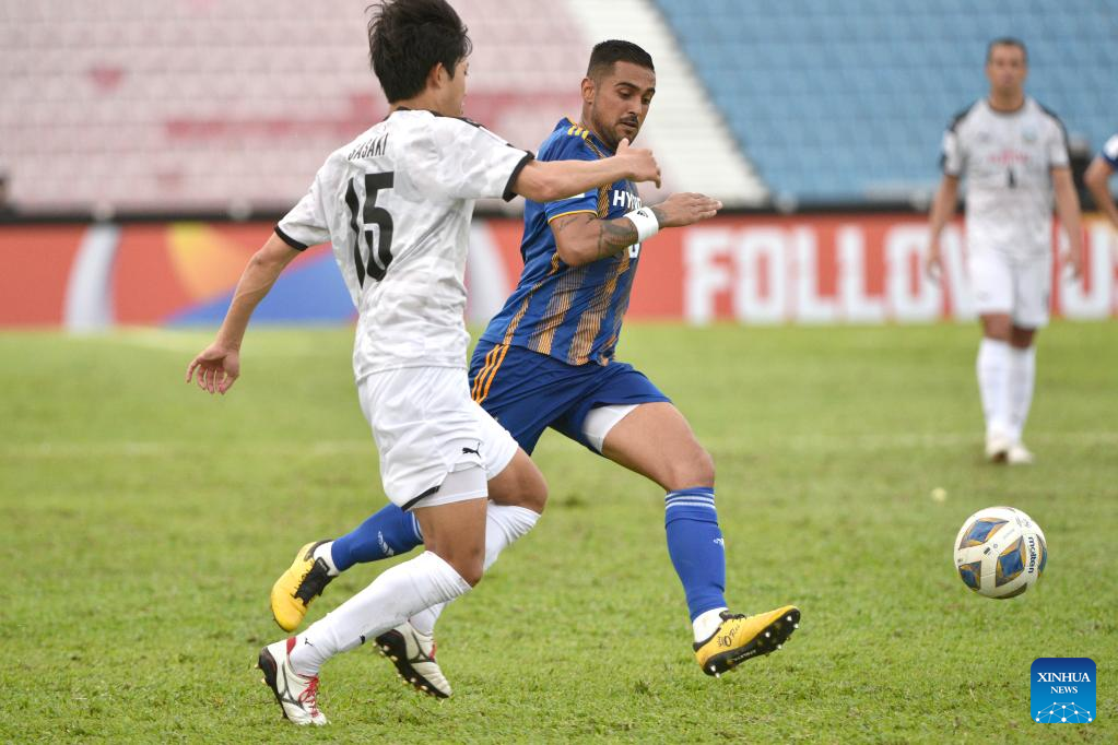 Jose De Carvalho (R) of Daegu FC shoots the ball during the 2022 AFC Champions League group F match between Shandong Taishan FC and Daegu FC in Buriram, Thailand, April 15, 2022. (Xinhua/Wang Teng)