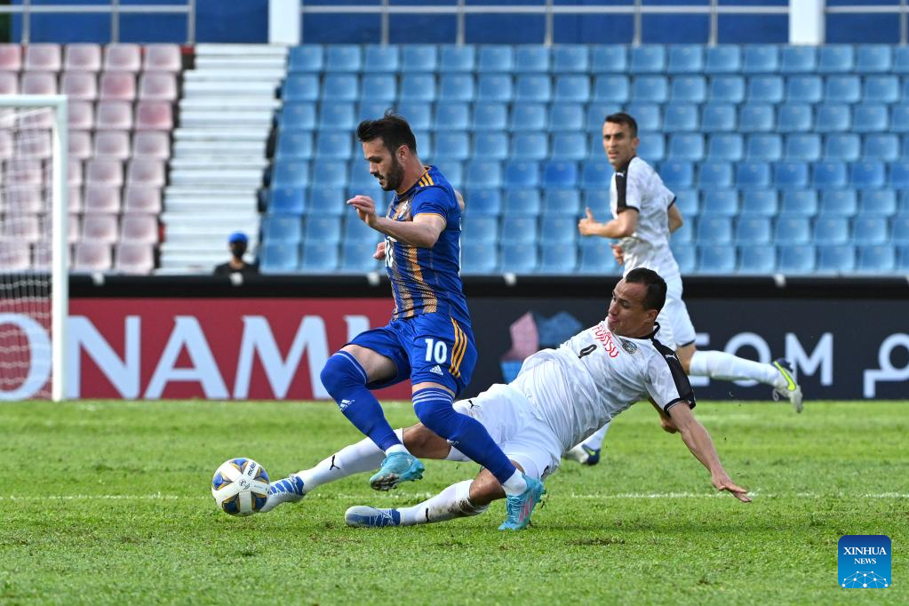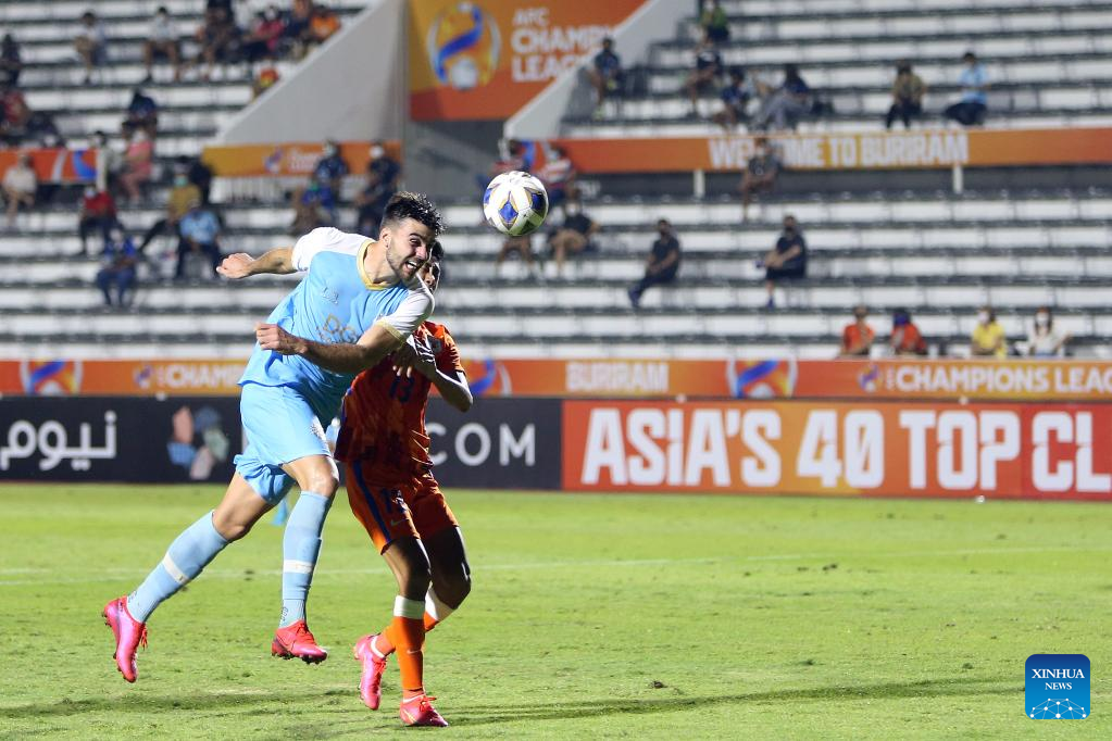 Jose De Carvalho (L) of Daegu FC heads the ball during the 2022 AFC Champions League group F match between Shandong Taishan FC and Daegu FC in Buriram, Thailand, April 15, 2022. (Xinhua/Wang Teng)