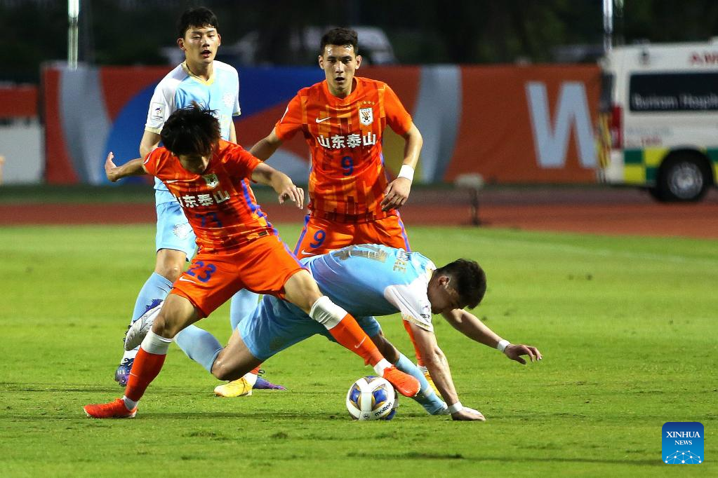 Yi Xianlong (L, front) of Shandong Taishan FC vies with Lee Yongrae (R, front) of Daegu FC during the 2022 AFC Champions League group F match in Buriram, Thailand, April 15, 2022. (Xinhua/Wang Teng)