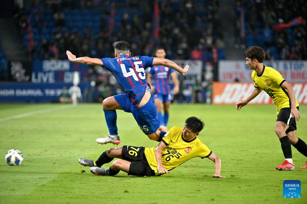 Wang Tianqing (down) of Guangzhou FC vies with Fernando Forestieri of Johor Darul Ta'zim during the AFC Champions League 2022 Group I match between Johor Darul Ta'zim of Malaysia and Guangzhou FC of China in Johor Bahru, Malaysia, April 15, 2022. (Photo by Chong Voon Chung/Xinhua)