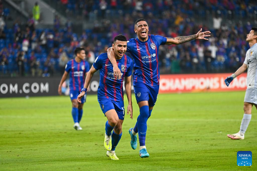 Ramadhan Saifullah (L) and Bergson Da Silva of Johor Darul Ta'zim celebrate scoring during the AFC Champions League 2022 Group I match between Johor Darul Ta'zim of Malaysia and Guangzhou FC of China in Johor Bahru, Malaysia, April 15, 2022. (Xinhua/Zhu Wei)