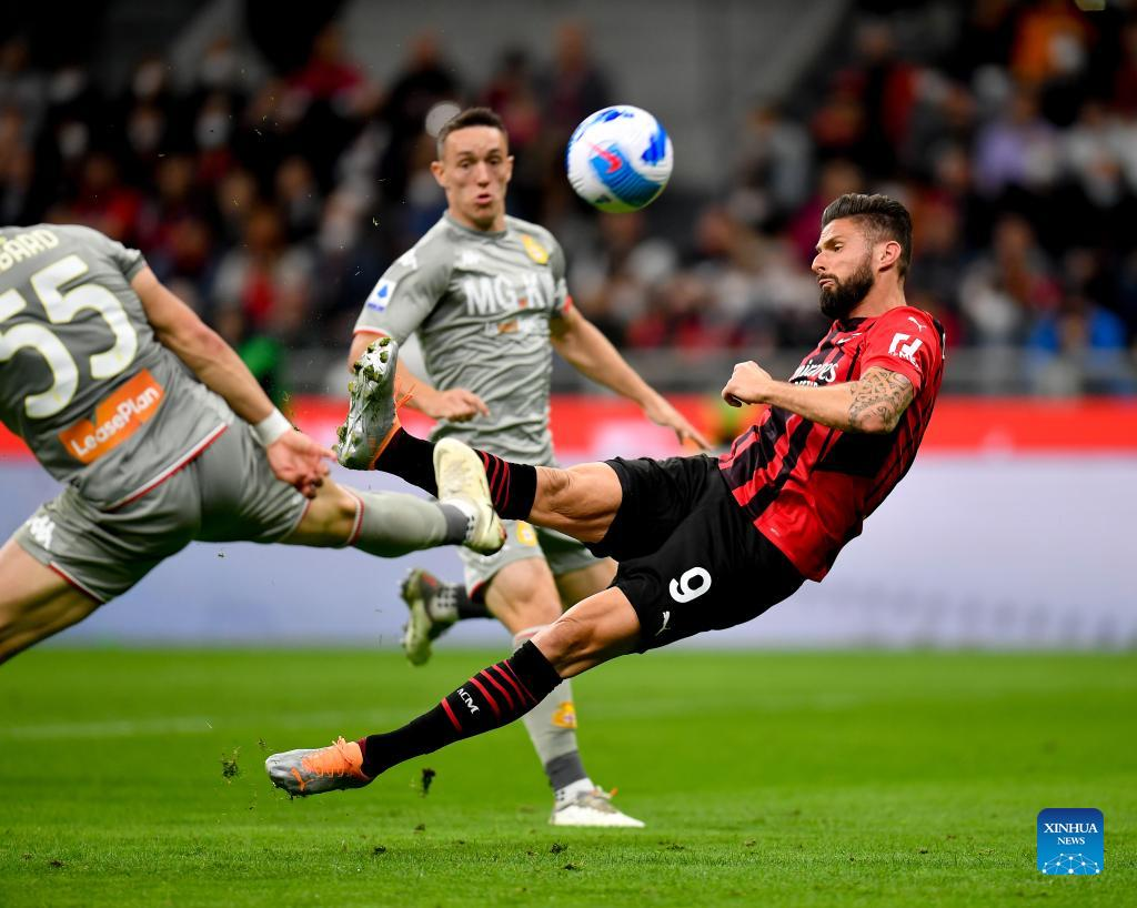 AC Milan's Olivier Giroud (R) is in action during a Serie A football match between AC Milan and Genoa in Milan, Italy, on April 15, 2022. (Photo by Daniele Mascolo/Xinhua)
