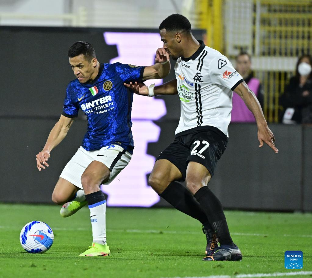 Inter Milan's Alexis Sanchez (L) vies with Spezia's Kelvin Amian during the Serie A football match between Inter Milan and Spezia in La Spezia, Italy, on April 15, 2022. (Str/Xinhua)