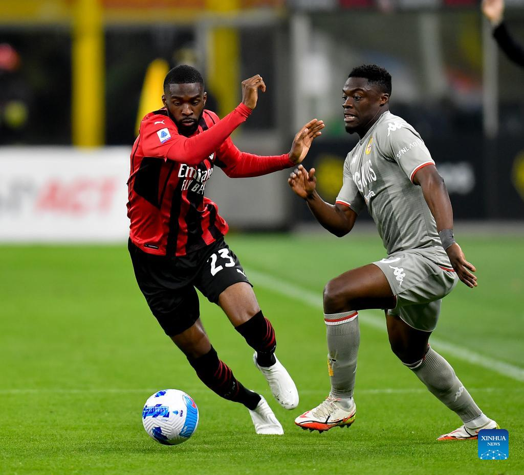AC Milan's Fikayo Tomori (L) vies with Genoa's Caleb Ekuban during a Serie A football match between AC Milan and Genoa in Milan, Italy, on April 15, 2022. (Photo by Daniele Mascolo/Xinhua)