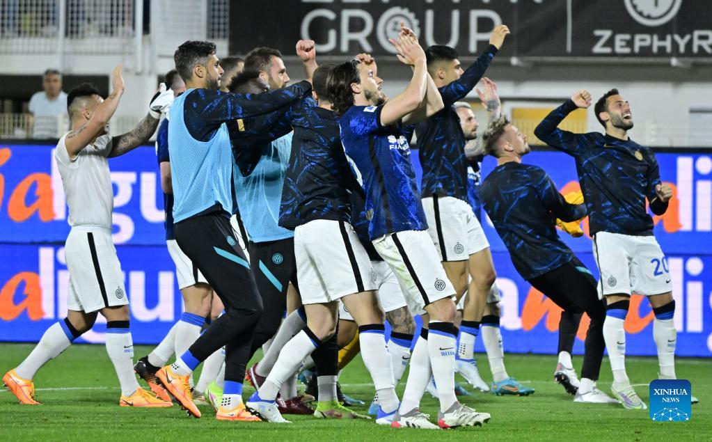 Inter Milan's players celebrate after a Serie A football match between Inter Milan and Spezia in La Spezia, Italy, on April 15, 2022. (Str/Xinhua)