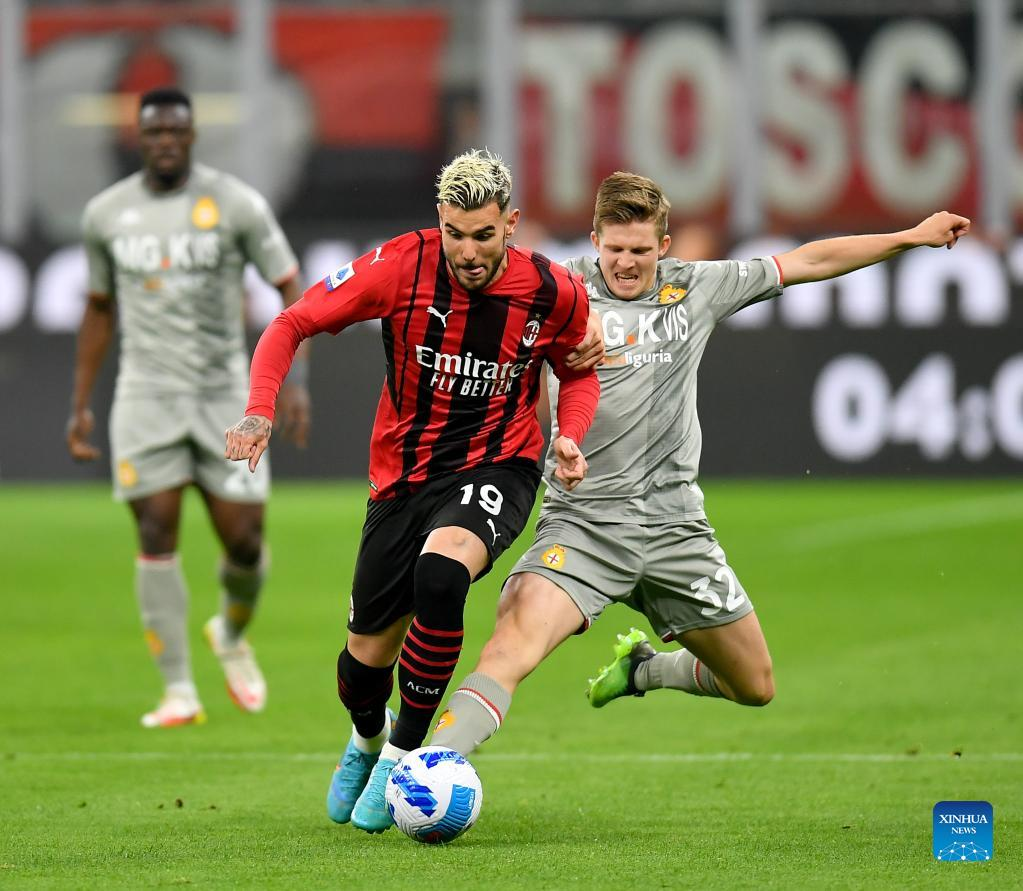 AC Milan's Theo Hernandez (L) vies with Genoa's Morten Frendrup during a Serie A football match between AC Milan and Genoa in Milan, Italy, on April 15, 2022. (Photo by Daniele Mascolo/Xinhua)