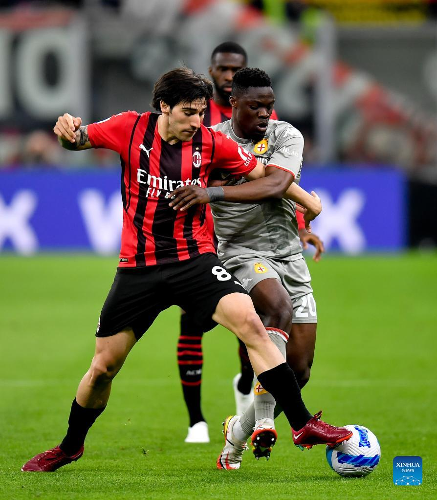 AC Milan's Sandro Tonali (L) vies with Genoa's Caleb Ekuban during a Serie A football match between AC Milan and Genoa in Milan, Italy, on April 15, 2022. (Photo by Daniele Mascolo/Xinhua)