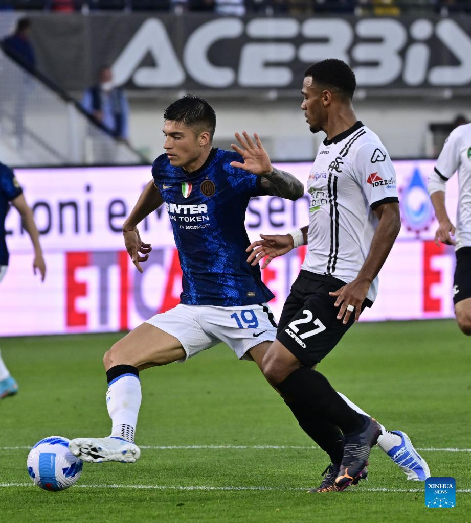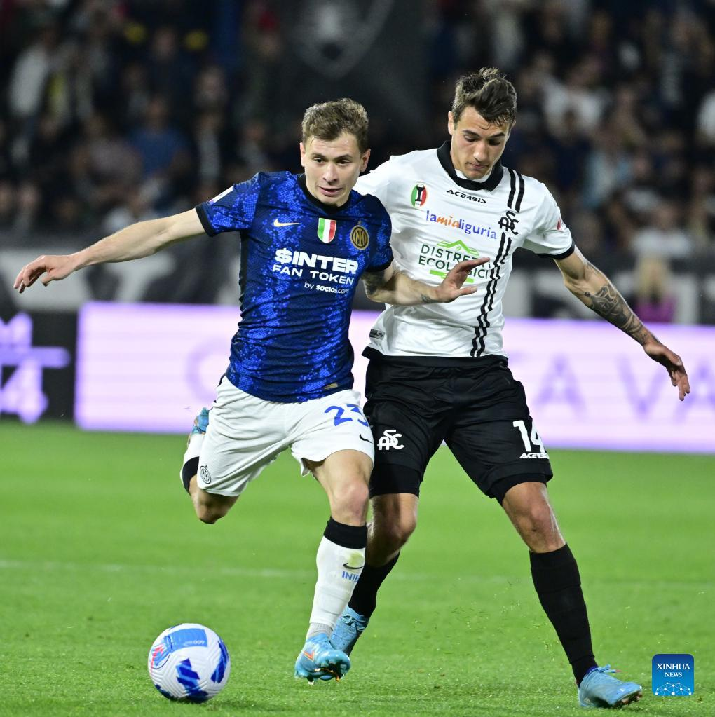 Inter Milan's Nicolo Barella (L) vies with Spezia's Jakub Kiwior during the Serie A football match between Inter Milan and Spezia in La Spezia, Italy, on April 15, 2022. (Str/Xinhua)