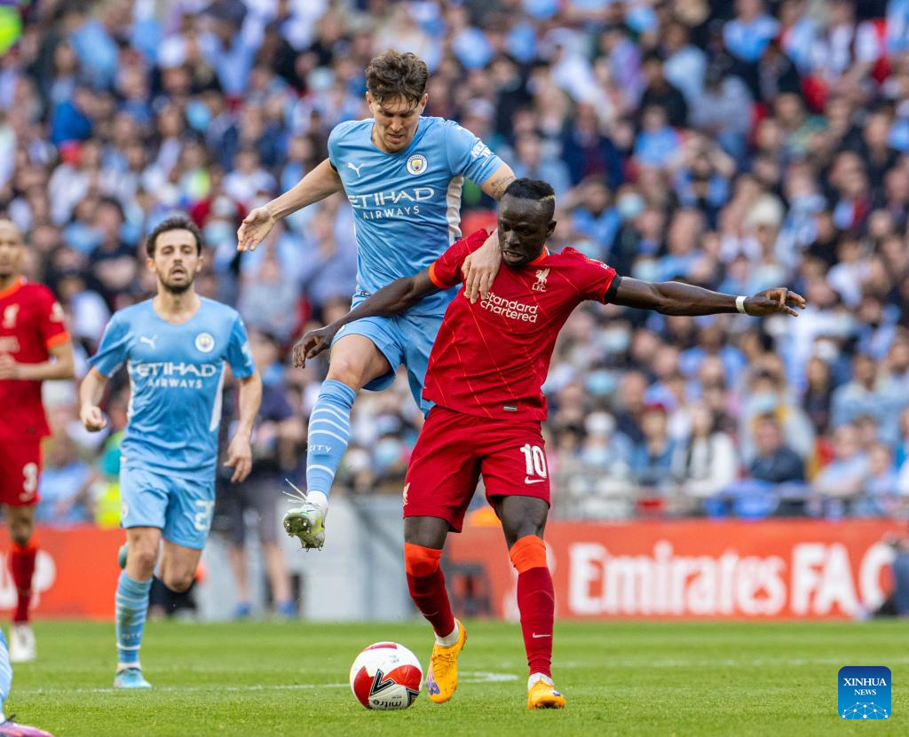 Liverpool's Sadio Mane (R) is tackled by Manchester City's John Stones during the FA Cup semifinal match between Manchester City and Liverpool in London, Britain, on April 16, 2022. Liverpool won 3-2 and advanced to the final. (Xinhua)