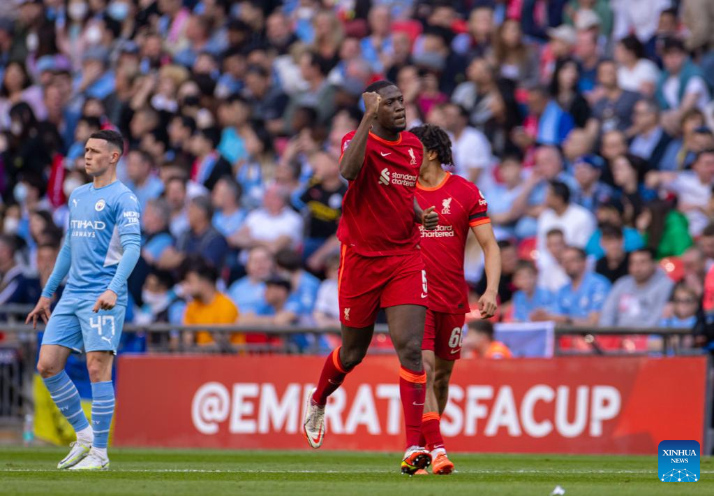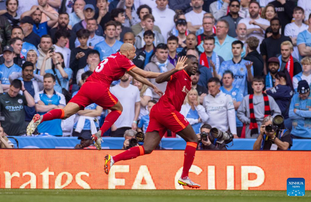 Liverpool's Ibrahima Konate (R) celebrates after scoring the first goal during the FA Cup semifinal match between Manchester City and Liverpool in London, Britain, on April 16, 2022. Liverpool won 3-2 and advanced to the final. (Xinhua)