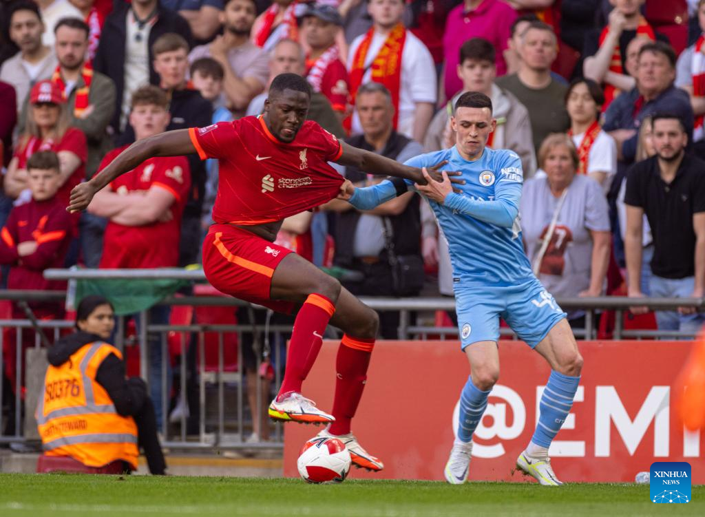 Liverpool's Ibrahima Konate (L) is pulled back by Manchester City's Phil Foden during the FA Cup semifinal match between Manchester City and Liverpool in London, Britain, on April 16, 2022. Liverpool won 3-2 and advanced to the final. (Xinhua)