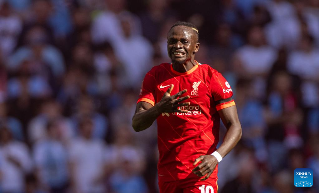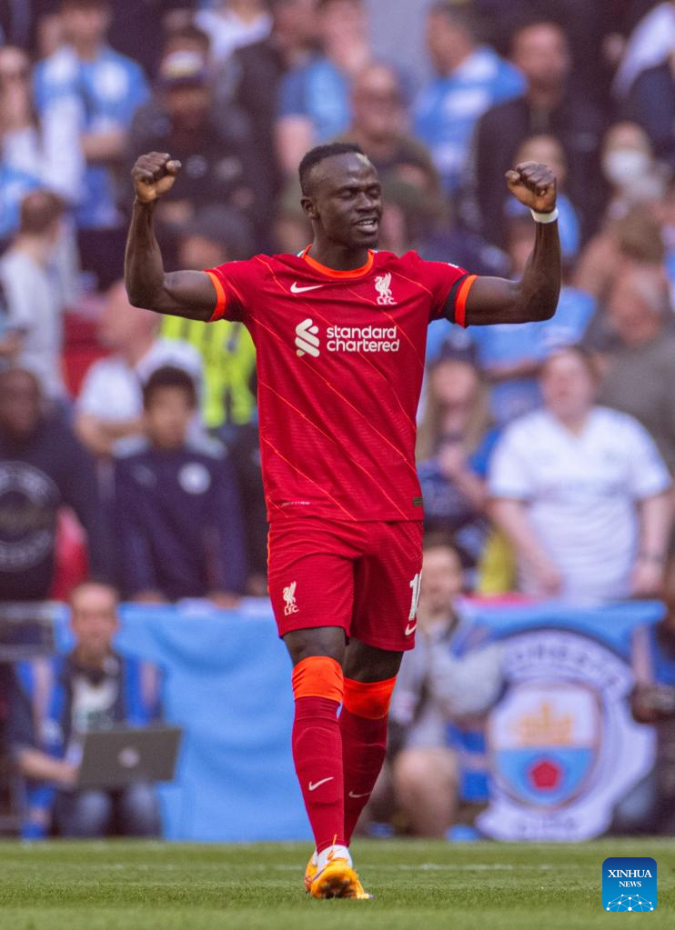 Liverpool's Sadio Mane celebrates after scoring during the FA Cup semifinal match between Manchester City and Liverpool in London, Britain, on April 16, 2022. Liverpool won 3-2 and advanced to the final. (Xinhua)