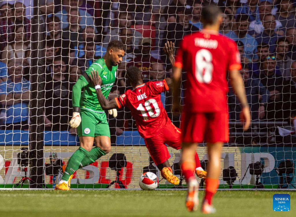 Liverpool's Sadio Mane dives in to score during the FA Cup semifinal match between Manchester City and Liverpool in London, Britain, on April 16, 2022. Liverpool won 3-2 and advanced to the final. (Xinhua)
