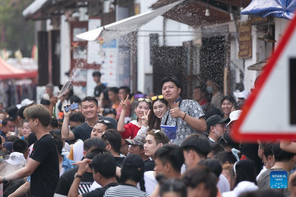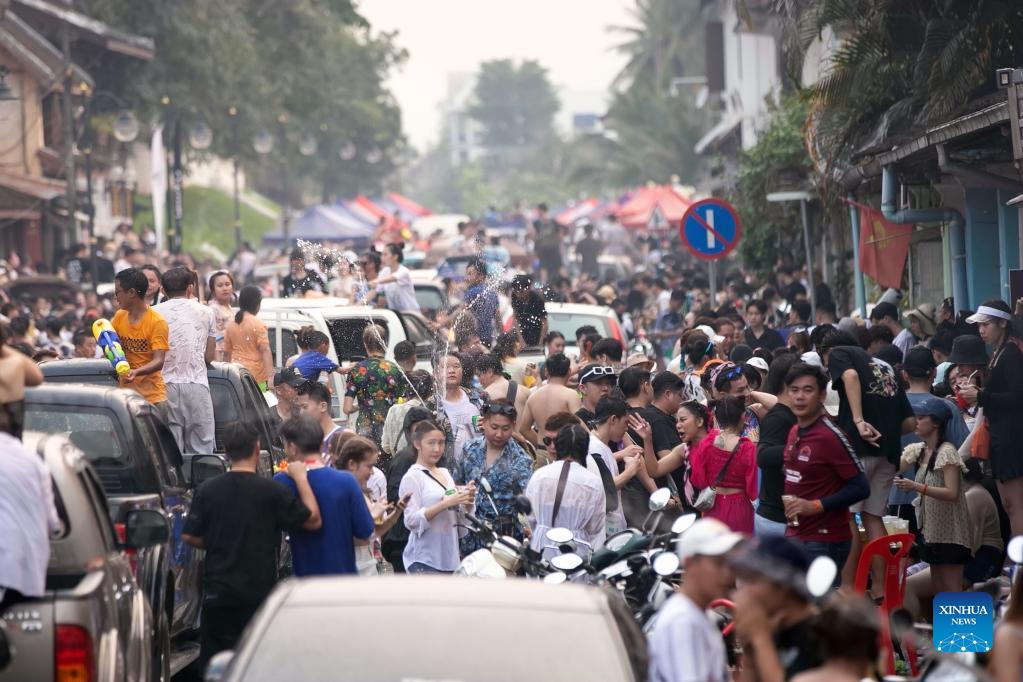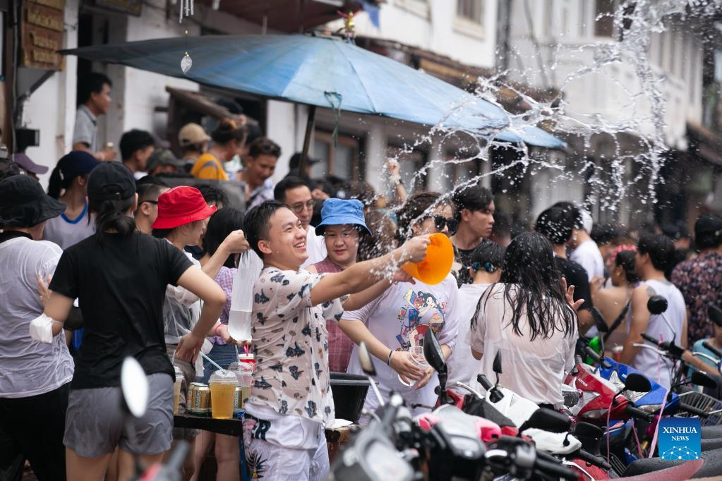 People celebrate the Songkran Festival, or the Lao New Year, in Luang Prabang, Laos, April 15, 2022. Laos celebrated Songkran from April 14 to 16. (Photo by Kaikeo Saiyasane/Xinhua)