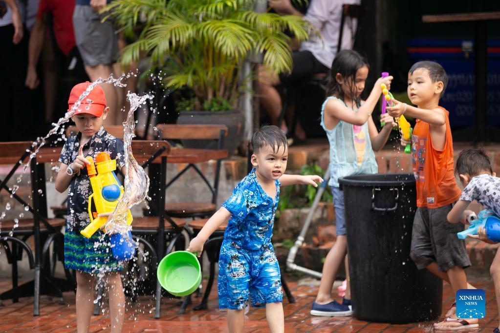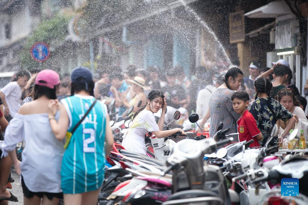 People splash water to each other to celebrate the Songkran Festival, or the Lao New Year, in Luang Prabang, Laos, April 16, 2022. Laos celebrated Songkran from April 14 to 16. (Photo by Kaikeo Saiyasane/Xinhua)