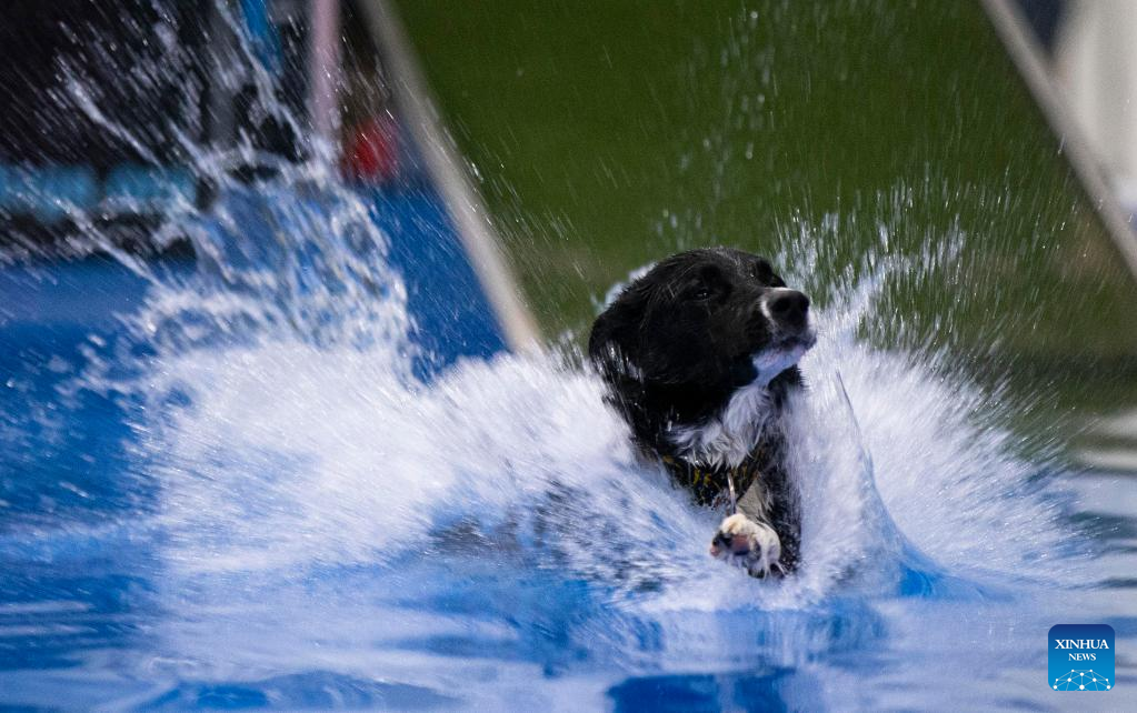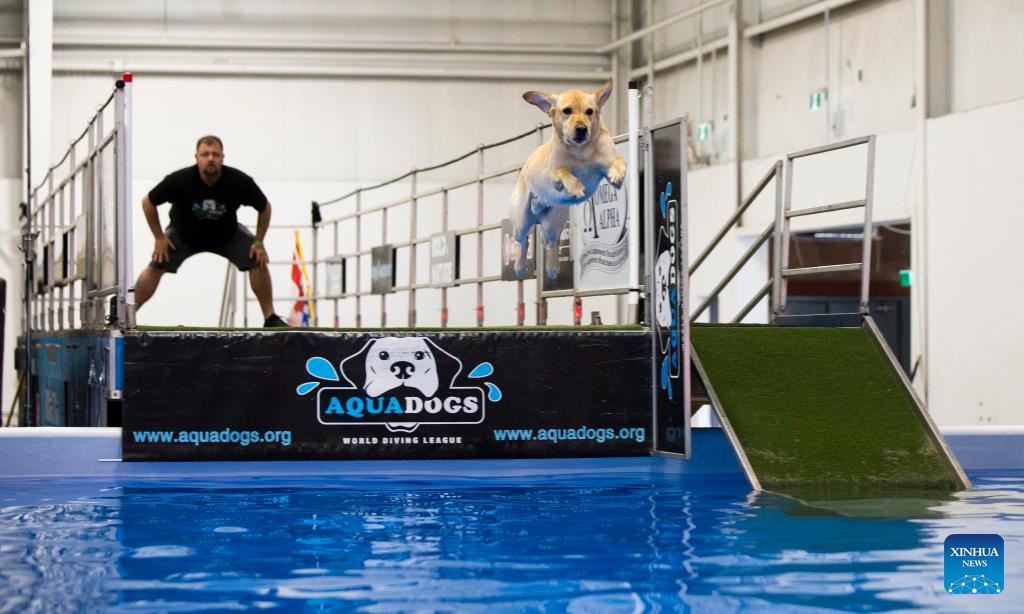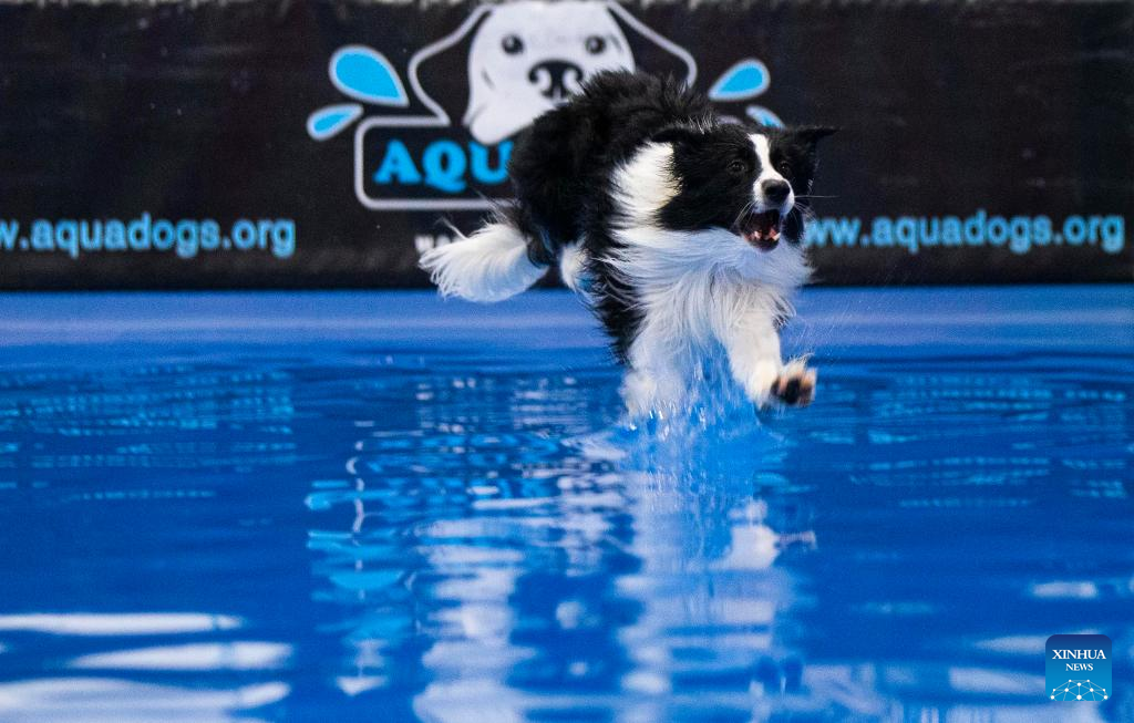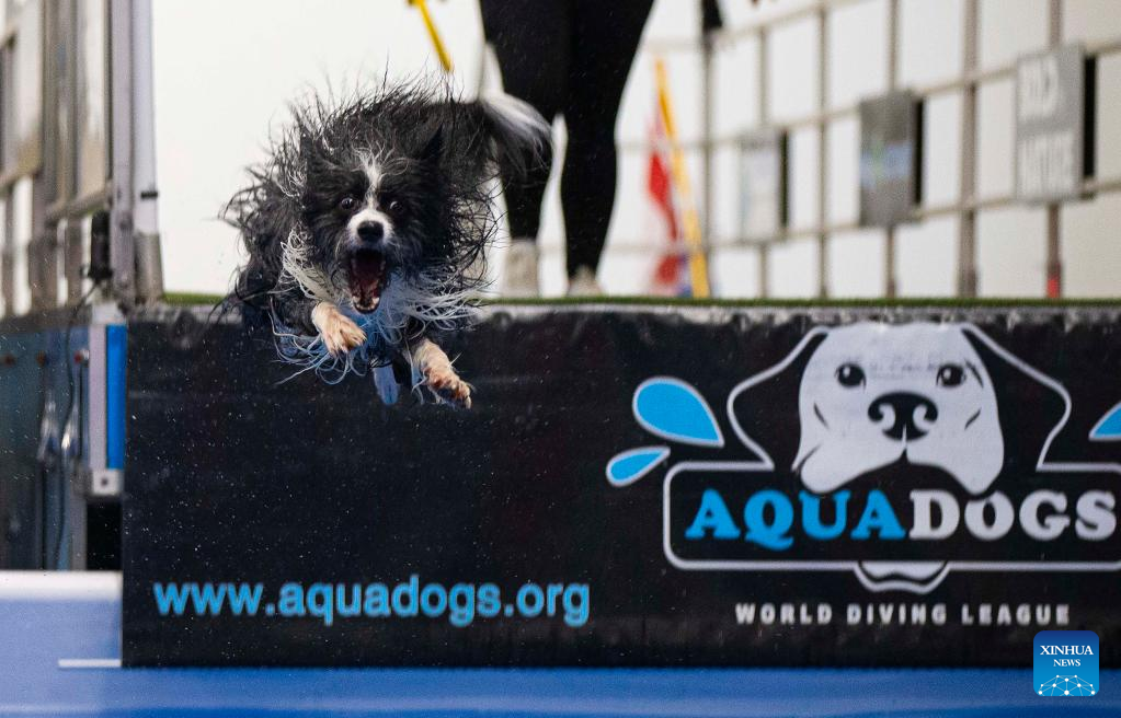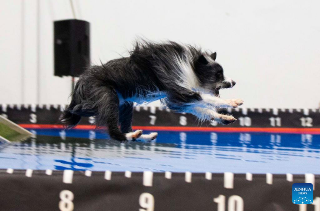 A pet dog jumps into a pool during the Dog Dock Diving Competition at the 2022 Spring Canadian Pet Expo in Mississauga, the Greater Toronto Area, Canada, on April 16, 2022. As one of the most popular canine sports, this competition is held here from April 15 to 17 with the participation of dozens of pet dogs and their owners. (Photo by Zou Zheng/Xinhua)