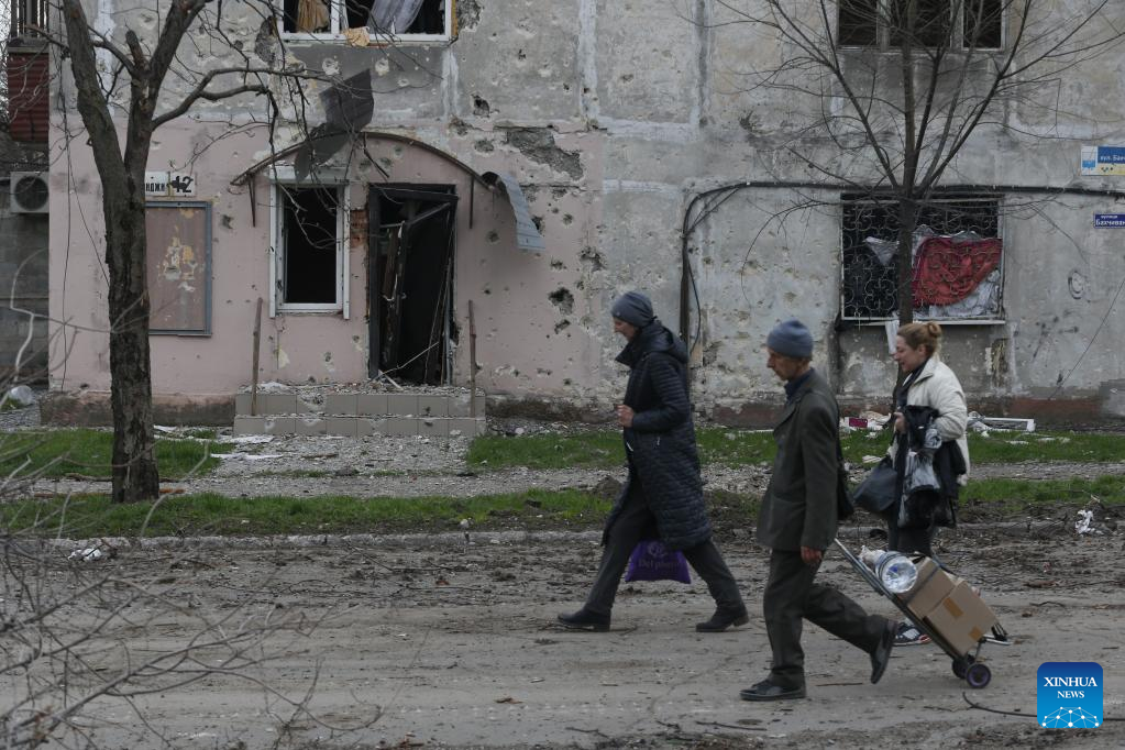 Residents walk near damaged buildings in Mariupol on April 18, 2022. (Photo by Victor/Xinhua)
