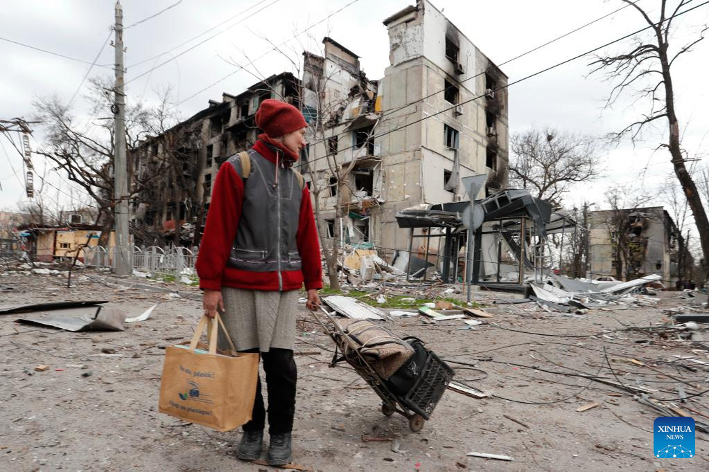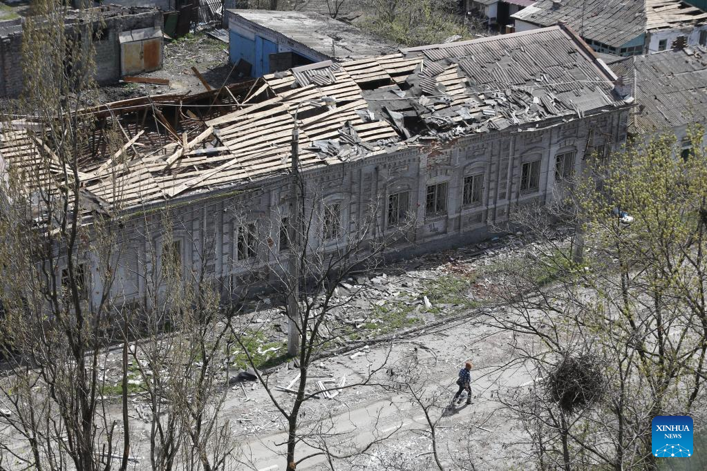 A resident walks near damaged buildings in Mariupol on April 18, 2022. (Photo by Victor/Xinhua)