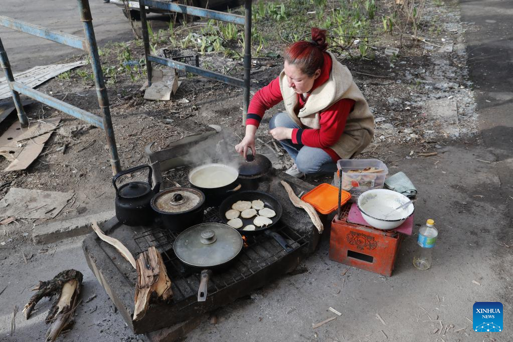A resident cooks food outside in Mariupol on April 18, 2022. (Photo by Victor/Xinhua)