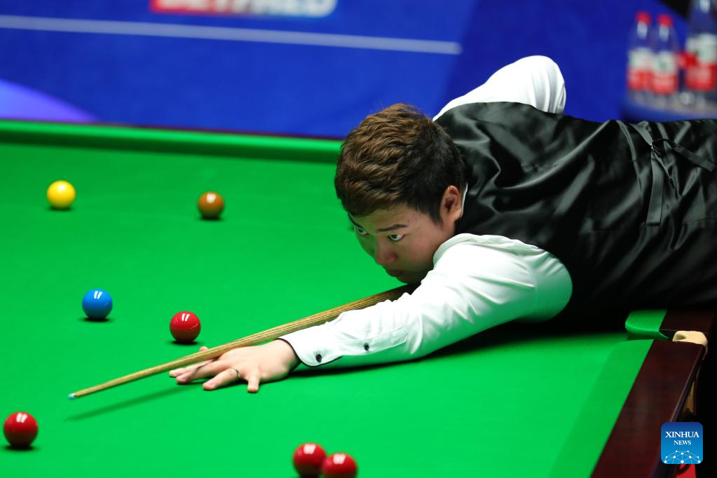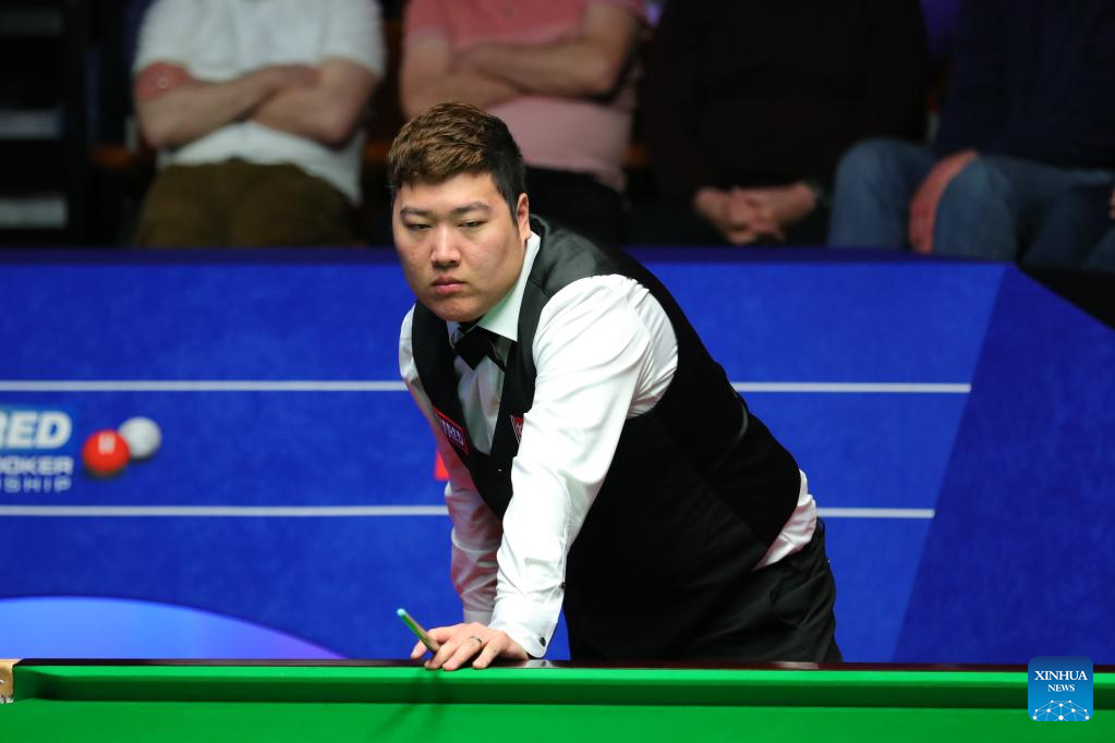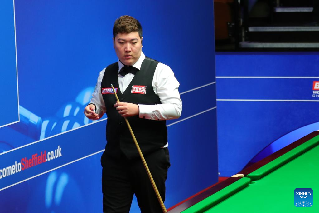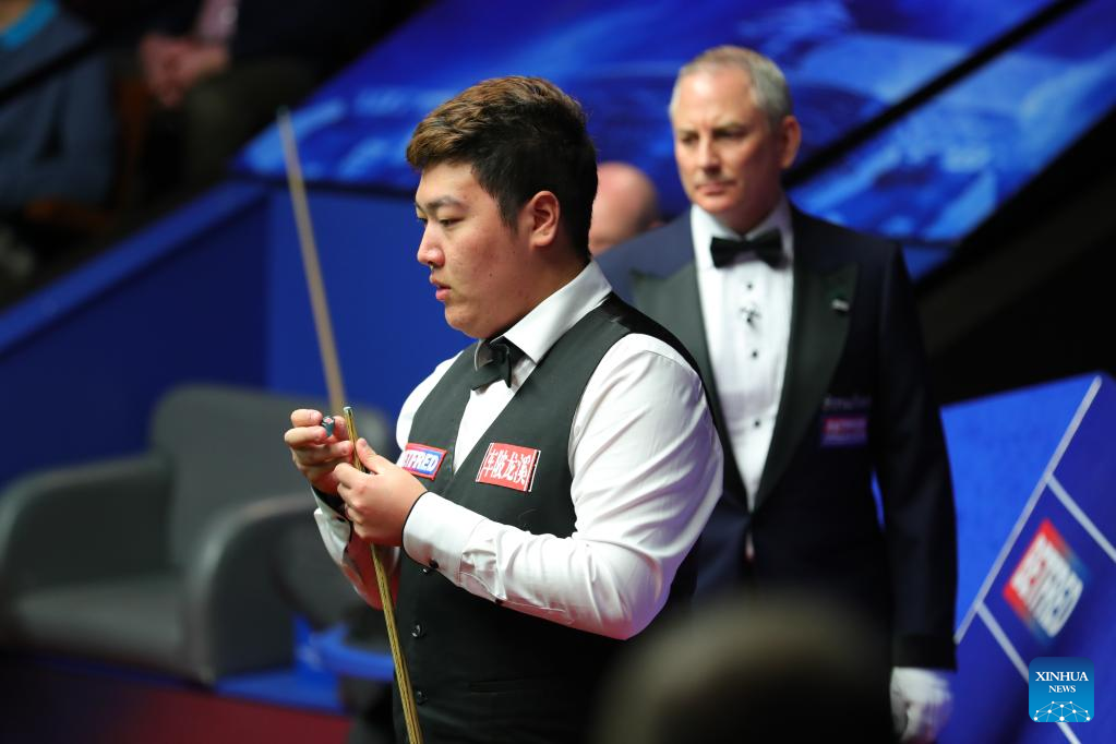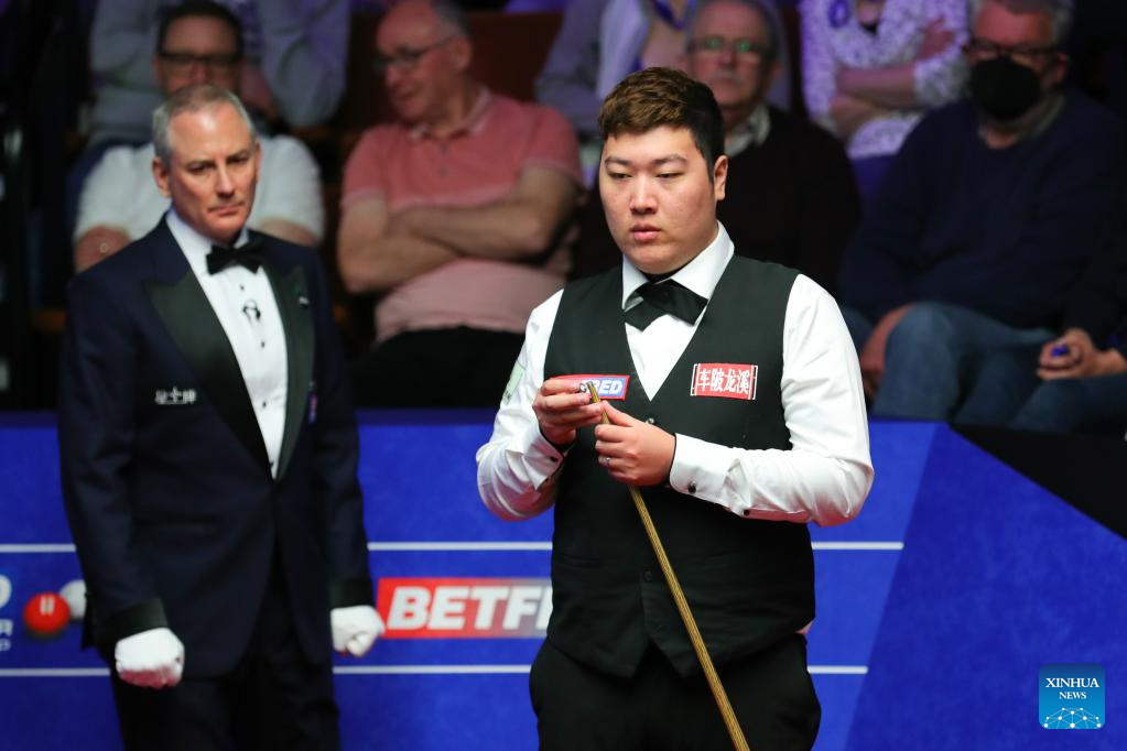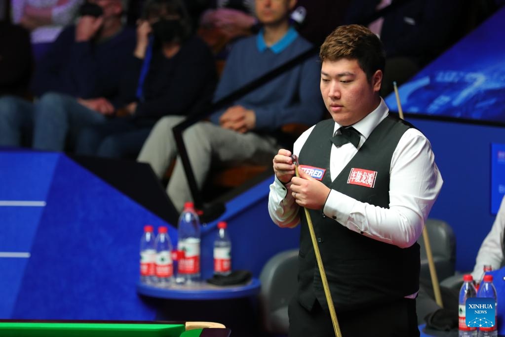 Yan Bingtao of China competes during the 1st round match against Chris Wakelin of England at the Betfred World Snooker Championships 2022 in Sheffield, Britain, April 19, 2022. (Photo by Zhai Zheng/Xinhua)