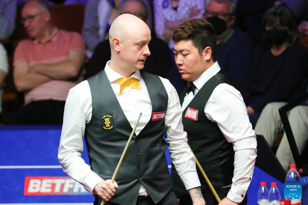 Yan Bingtao (R) of China competes during the 1st round match against Chris Wakelin of England at the Betfred World Snooker Championships 2022 in Sheffield, Britain, April 19, 2022. (Photo by Zhai Zheng/Xinhua)