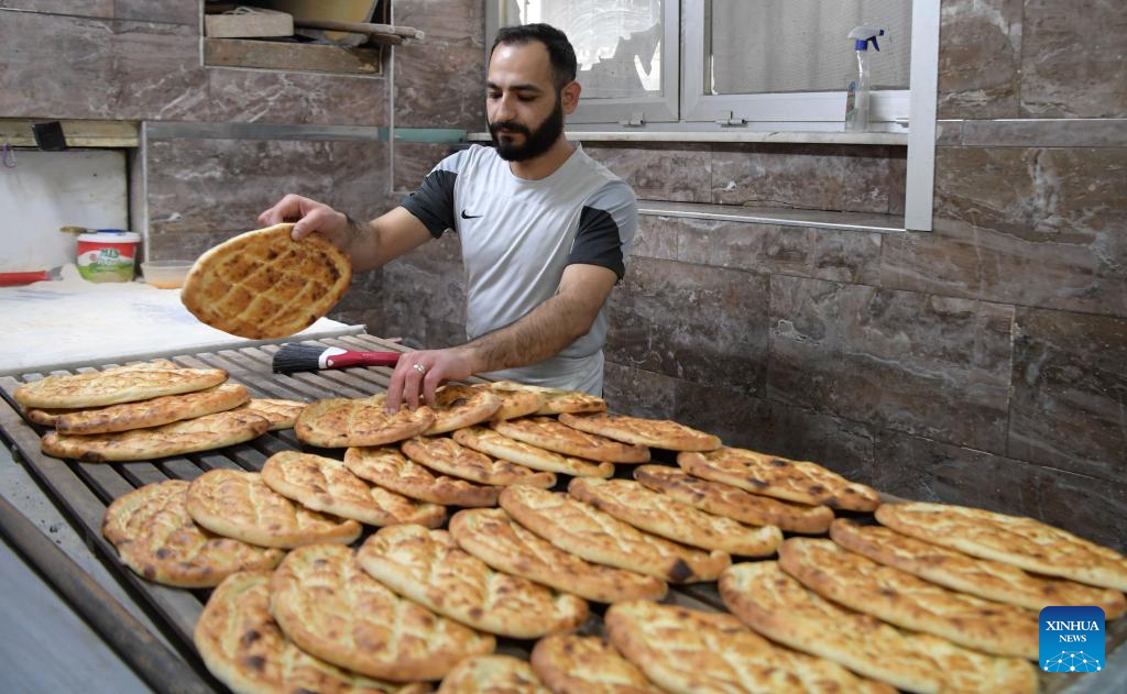 A baker arranges Ramadan Pide at a bakery in Istanbul, Turkey, April 20, 2022. (Xinhua/Shadati)
