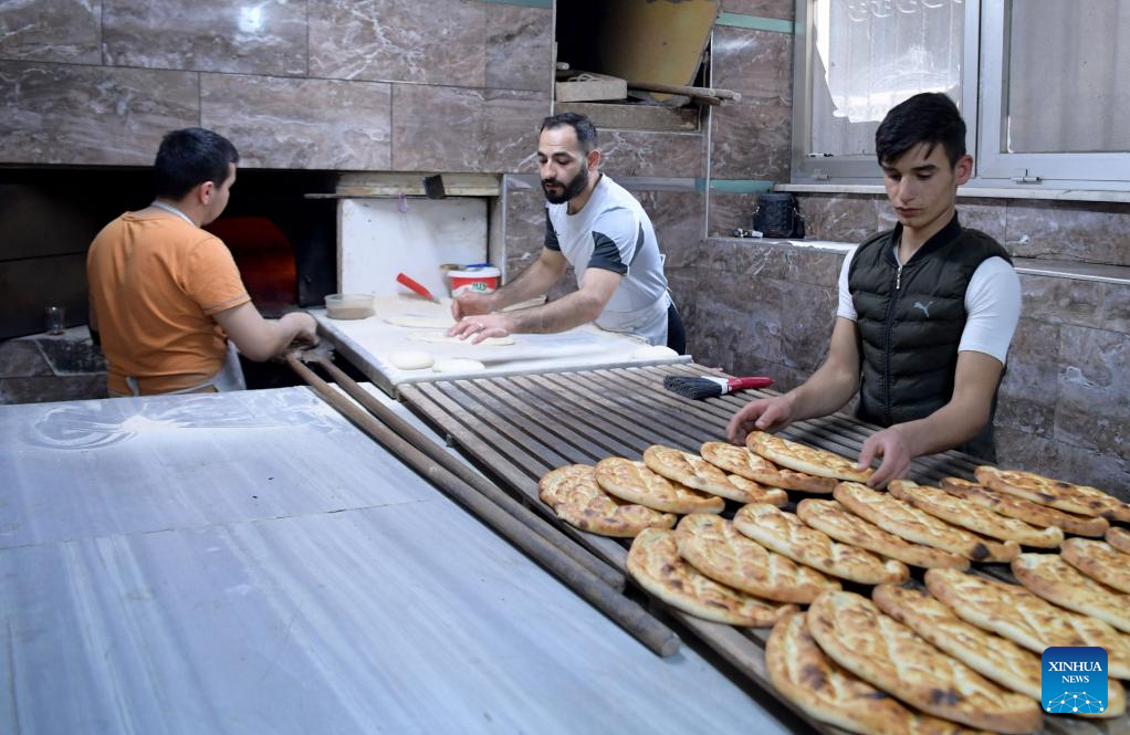 Bakers make Ramadan Pide at a bakery in Istanbul, Turkey, April 20, 2022. (Xinhua/Shadati)
