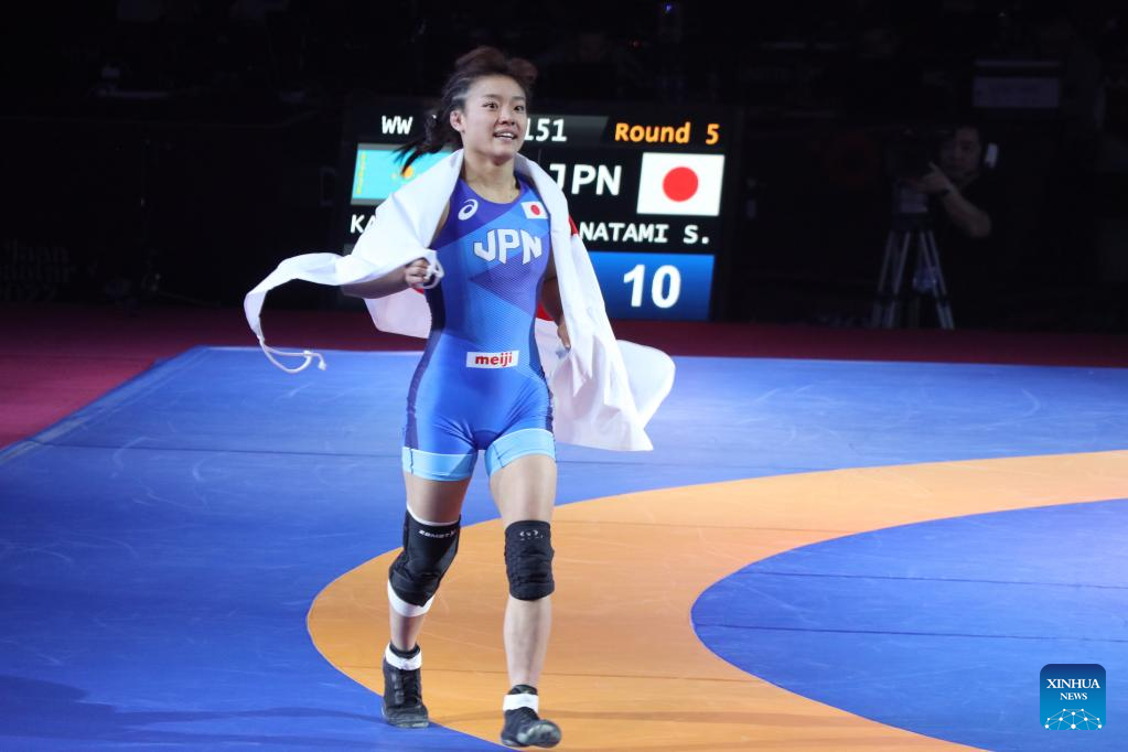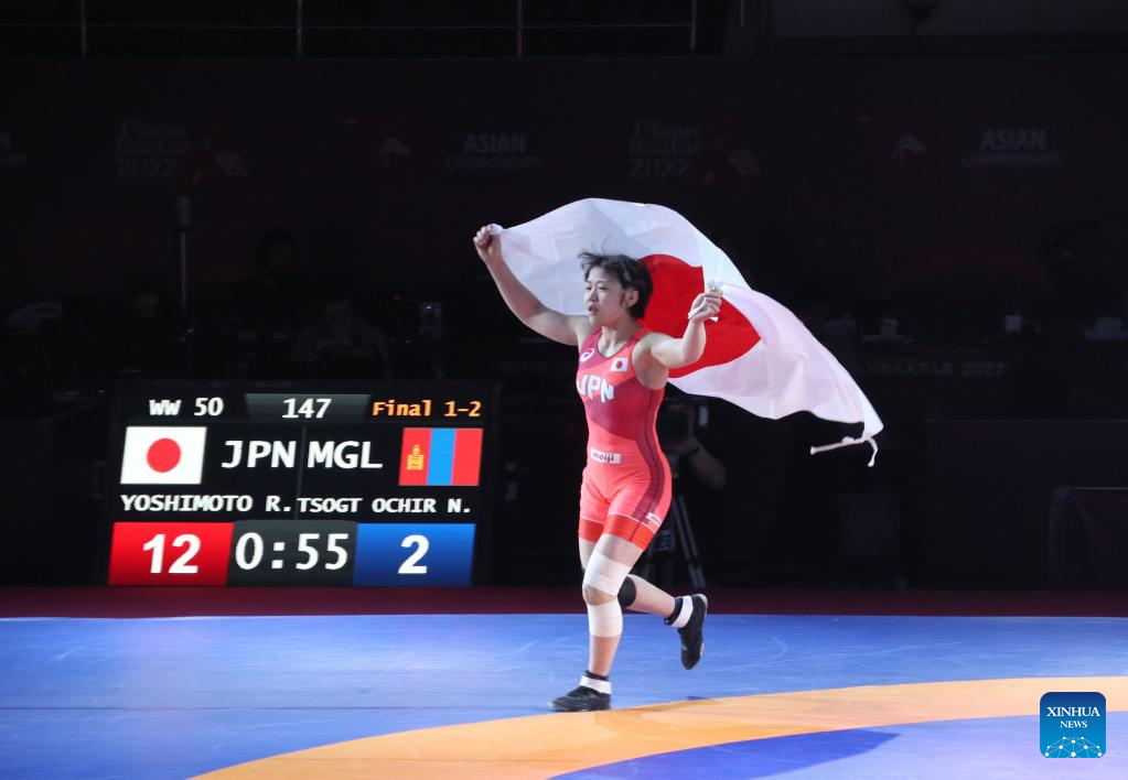 Yoshimoto Remina of Japan celebrates after claiming the title of the women's 50 kg freestyle category at the 2022 Asian Wrestling Championships in Mongolia's capital Ulan Bator on April 21, 2022. (Photo by Suriya/Xinhua)