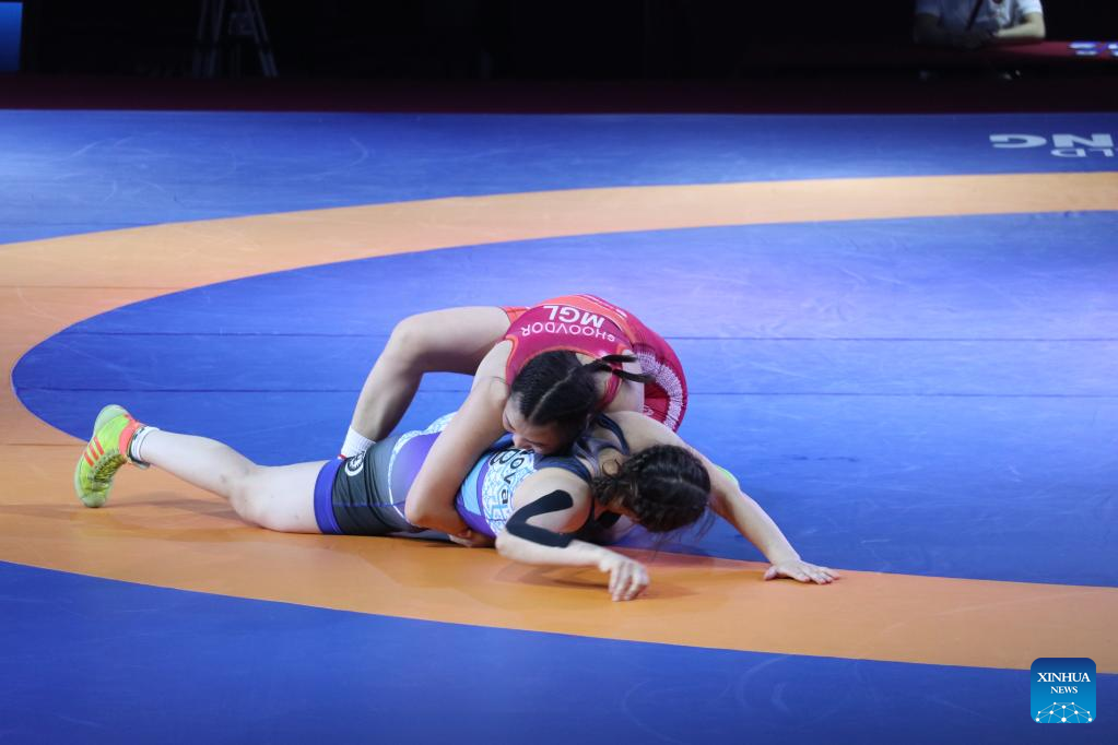 Mongolia's Baatarjav Shoovdor (top) competes with Dilfuza Aimbetova of Uzbekistan during the round 5 match of the women's 59 kg freestyle category at the 2022 Asian Wrestling Championships in Mongolia's capital Ulan Bator on April 21, 2022. (Photo by Suriya/Xinhua)