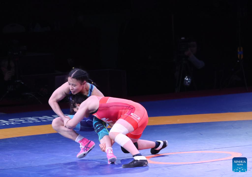 Natami Sara (front) of Japan competes with Diana Kayumova of Kazakhstan during the round 5 match in the women's 59 kg freestyle category at the 2022 Asian Wrestling Championships in Mongolia's capital Ulan Bator on April 21, 2022. (Photo by Suriya/Xinhua)