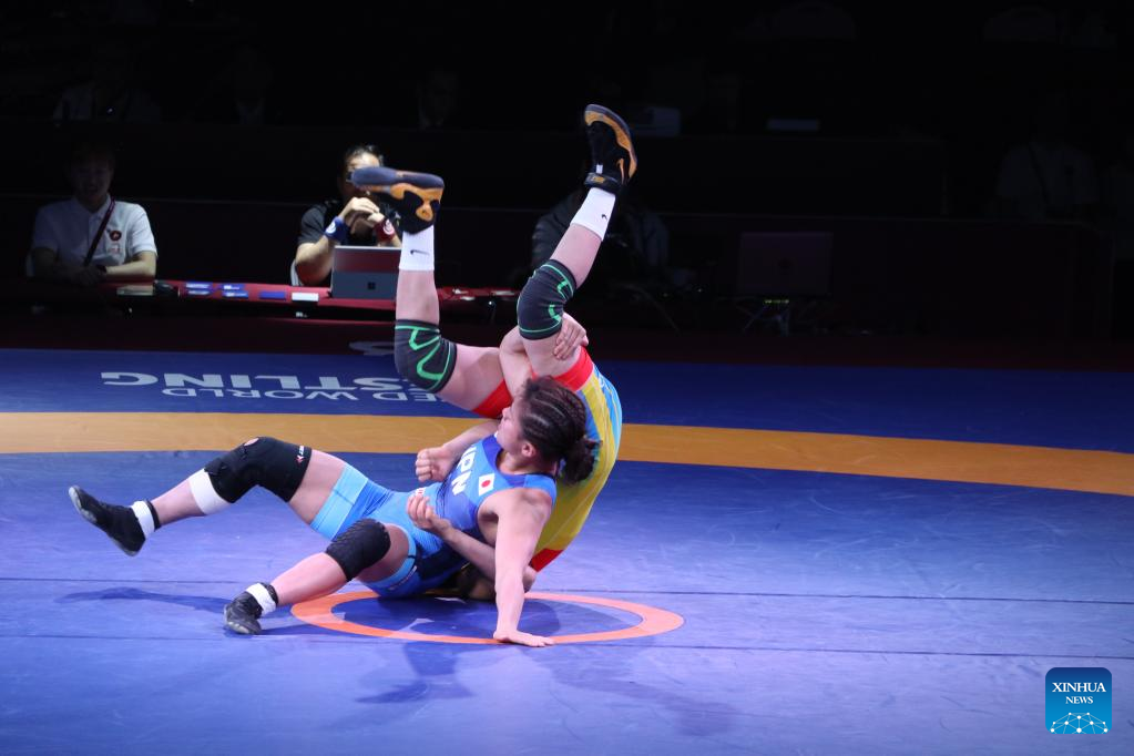 Kyrgyzstan's Aiperi Medet Kyzy (L) competes with Kagami Yuka of Japan during the women's 76 kg freestyle final at the 2022 Asian Wrestling Championships in Mongolia's capital Ulan Bator on April 21, 2022. (Photo by Suriya/Xinhua)