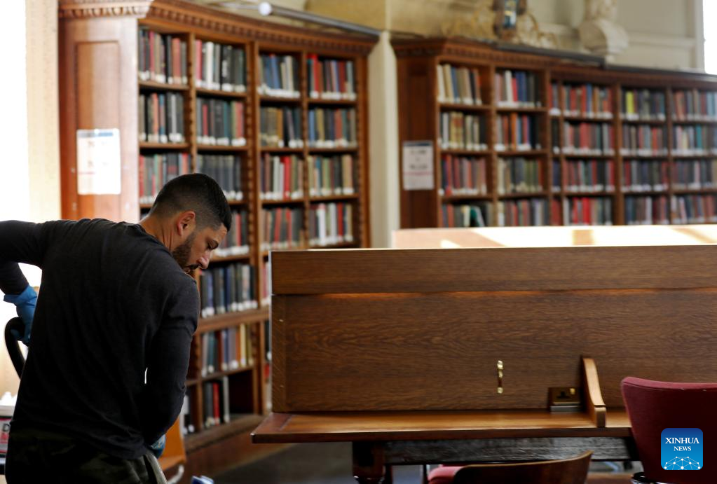 A staff member cleans floor in the Bodleian Libraries in the University of Oxford, Britain, April 21, 2022. As the library service supporting the University of Oxford, Bodleian Libraries include the principal University library, the Bodleian Library, which has been a library of legal deposit for 400 years, as well as 27 other libraries across Oxford including major research libraries and faculty, department and institute libraries.