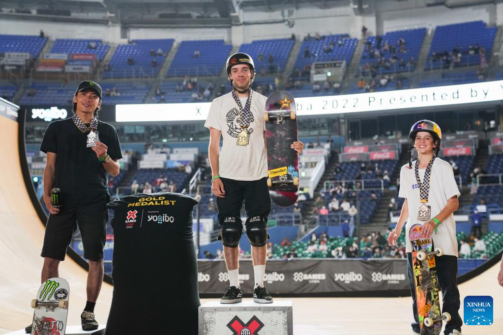 Bronze medalist Gui Khury of Brazil celebrates during the awarding ceremony after the skateboard Vert Final of X Games Chiba 2022 in Chiba, Japan, April 22, 2022. (Xinhua/Zhang Xiaoyu)