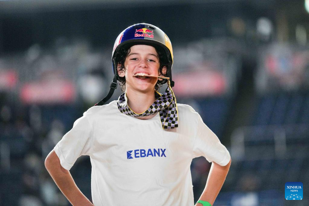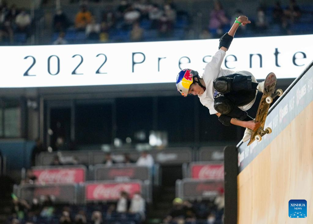 Bronze medalist Gui Khury of Brazil competes during the skateboard Vert Final of X Games Chiba 2022 in Chiba, Japan, April 22, 2022. (Xinhua/Zhang Xiaoyu)