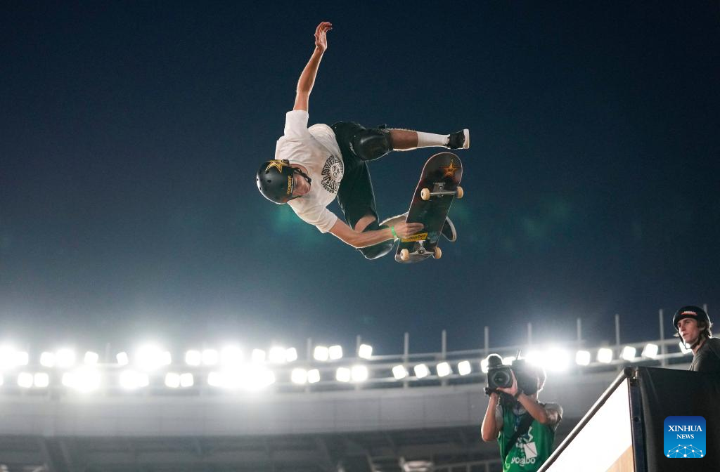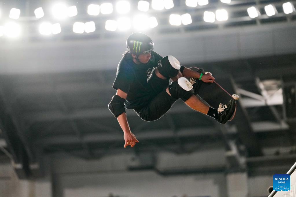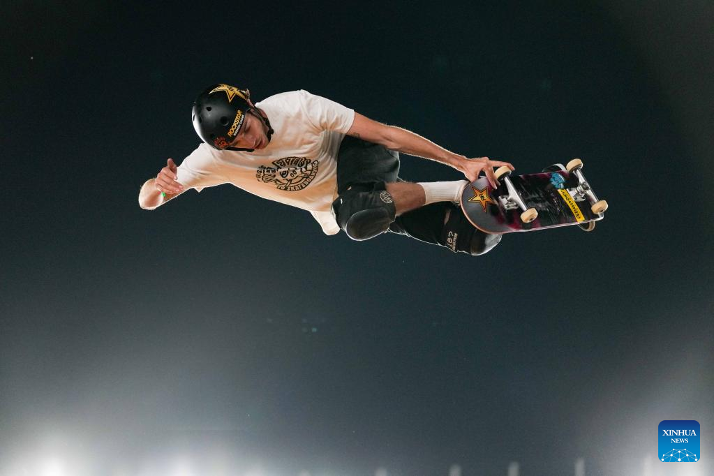 Gold medalist Jimmy Wilkins of the United States competes during the skateboard Vert Final of X Games Chiba 2022 in Chiba, Japan, April 22, 2022. (Xinhua/Zhang Xiaoyu)