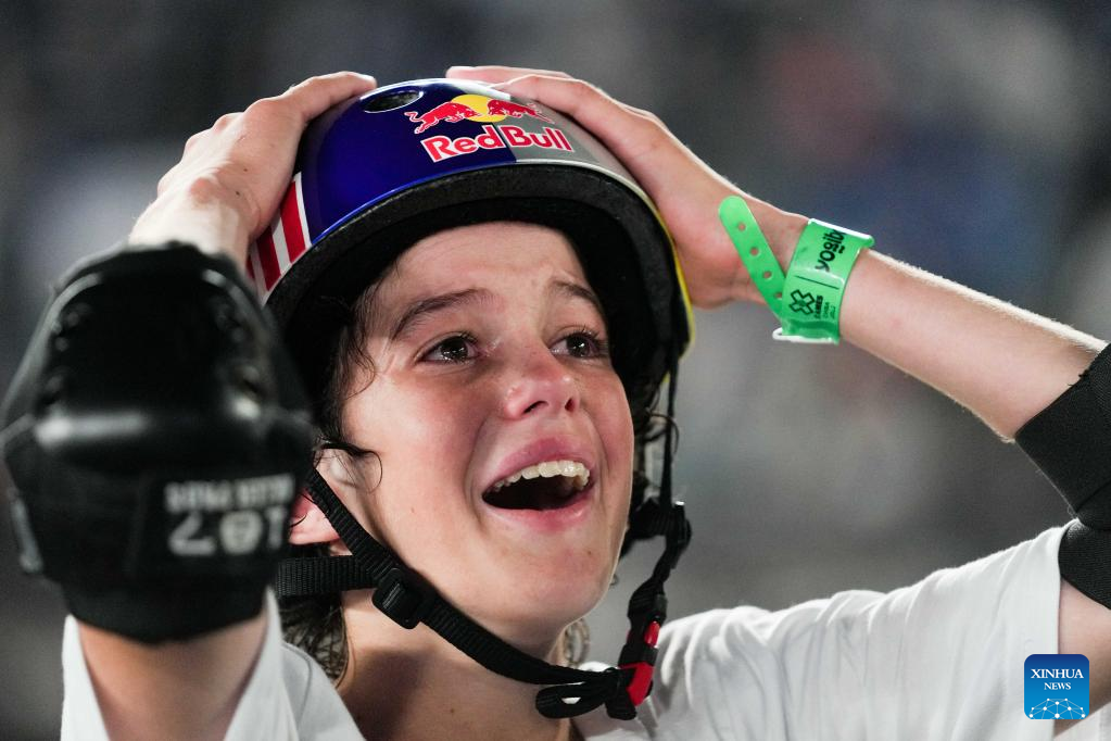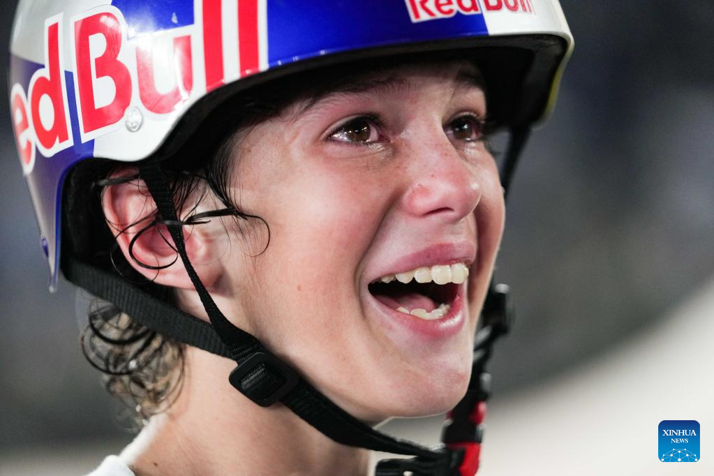 Bronze medalist Gui Khury of Brazil reacts after the skateboard Vert Final of X Games Chiba 2022 in Chiba, Japan, April 22, 2022. (Xinhua/Zhang Xiaoyu)