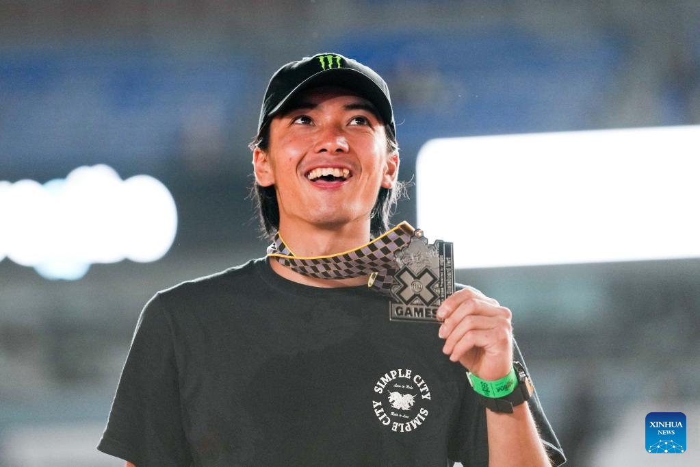 Silver medalist Shibata Moto of Japan reacts during the ceremony after the skateboard Vert Final of X Games Chiba 2022 in Chiba, Japan, April 22, 2022. (Xinhua/Zhang Xiaoyu)