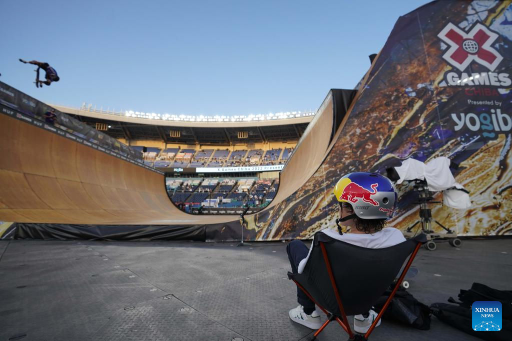 Bronze medalist Gui Khury (front) of Brazil rests while other contestants pratice for the skateboard Vert Final of X Games Chiba 2022 in Chiba, Japan, April 22, 2022. (Xinhua/Zhang Xiaoyu)