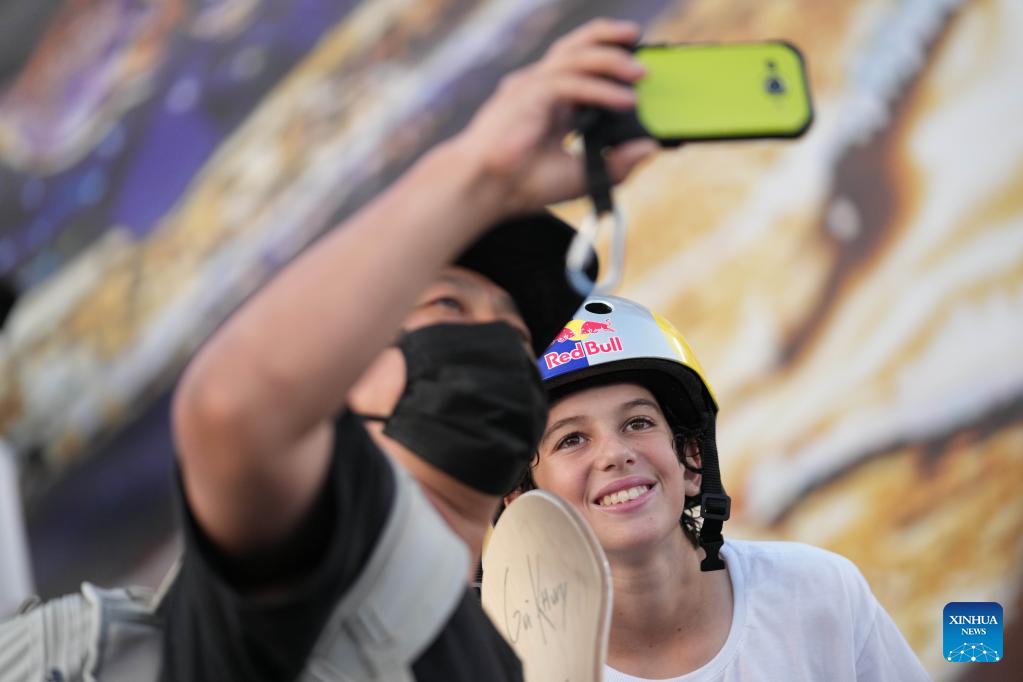 Bronze medalist Gui Khury (R) of Brazil takes a selfie with a supporter during the skateboard Vert Final of X Games Chiba 2022 in Chiba, Japan, April 22, 2022. (Xinhua/Zhang Xiaoyu)